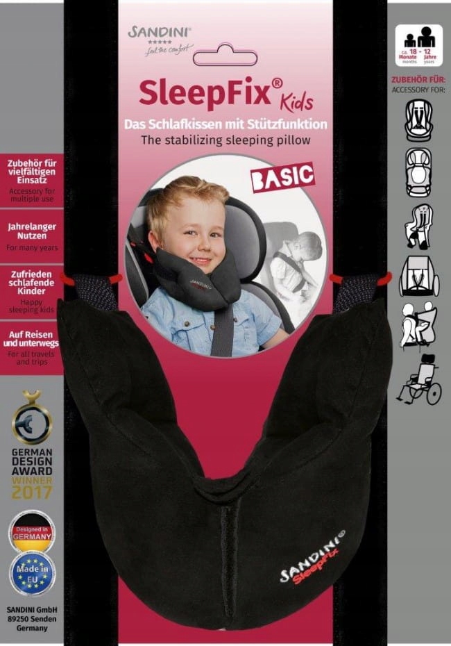 Стабилизирующая подушка SleepFix от немецкой компании SANDINI — безопасное, простое и удобное решение, предназначенное для маленьких пассажиров. Продукция SANDINI имеет положительную рекомендацию института ADAC и получила оценку «очень хорошо» в тестах престижного журнала Öko-Test. Стабилизирующая подушка Sandini Sleepfix рекомендуется детям от 18 до 12 лет.