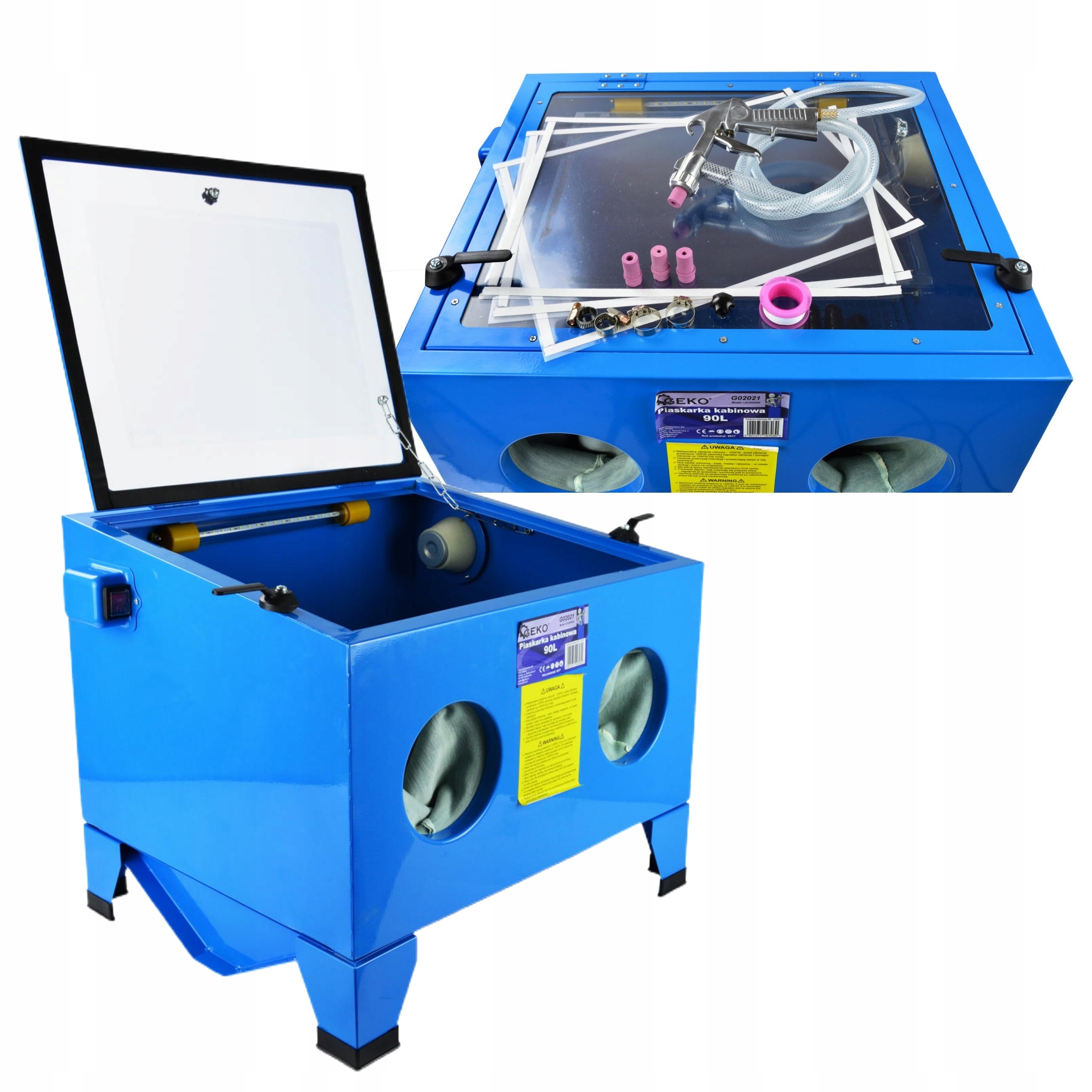 Машина имеет прочную камеру с поднимающейся вверх заслонкой, пескоструйный пистолет, четыре керамические насадки, качественные рабочие перчатки, освещение рабочего места и большое окно-глазок.
