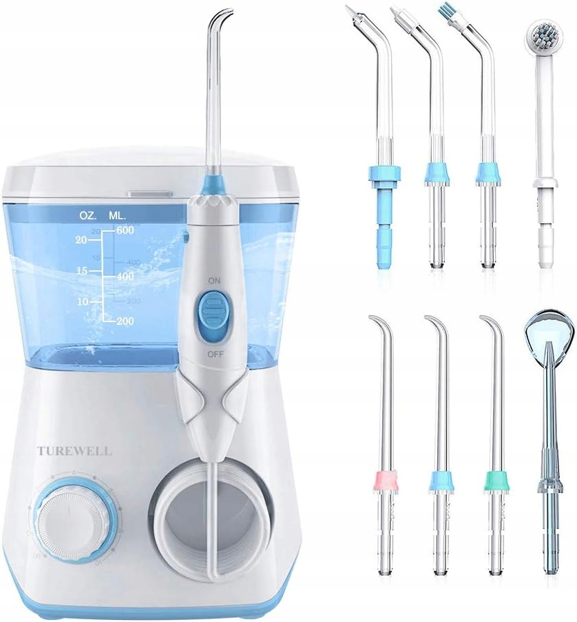 Электрический очиститель межзубных промежутков TUREWELL с 10 уровнями давления и 8 насадками, водонепроницаемым ирригатором полости рта, 600 мл воды для дома (белый)