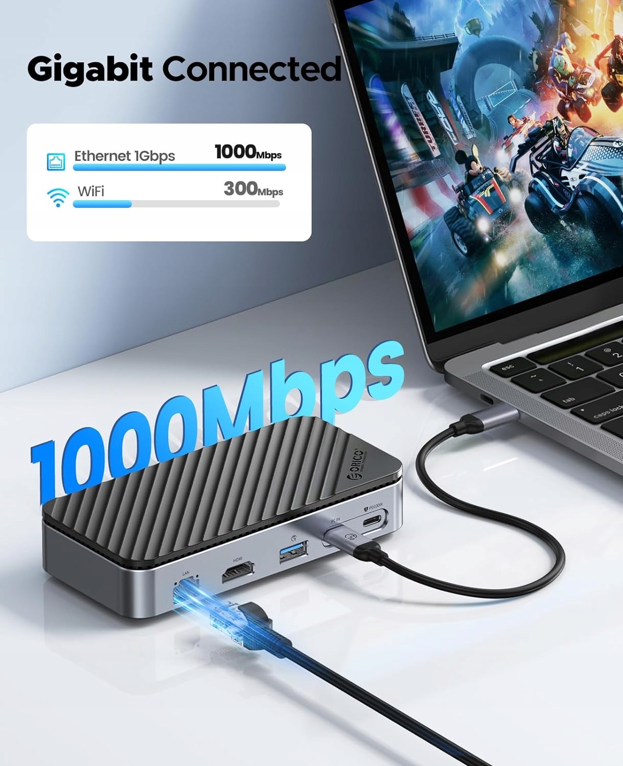 【1000 м Gigabit Ethernet и 4K HDMI】: разъем RJ45 Ethernet 1000 Мбит/с обеспечивает большую пропускную способность сети для быстрого и стабильного доступа в Интернет. Разъем HDMI поддерживает большие ЖК-телевизоры или дисплеи, совместимые с выходным сигналом 4K, 60 Гц, и обеспечивает визуальное наслаждение.