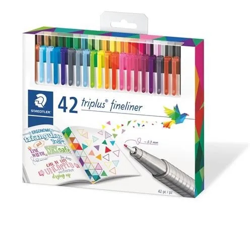 Stedtler Triplus Fineliner 42 – сорок два насыщенных цвета. Чернила на водной основе характеризуются невероятной стойкостью, высокой интенсивностью и коротким временем высыхания. Не размазывает, кончик не царапает бумагу, им можно плавно проводить по бумаге, проводя линию шириной 0,3 мм. Правильно спроектированный колпачок защищает лайнер от высыхания. Эргономичный треугольный корпус обеспечивает исключительный комфорт при письме. Ручки Triplus Fineliner подходят для письма, рисования и дизайна.