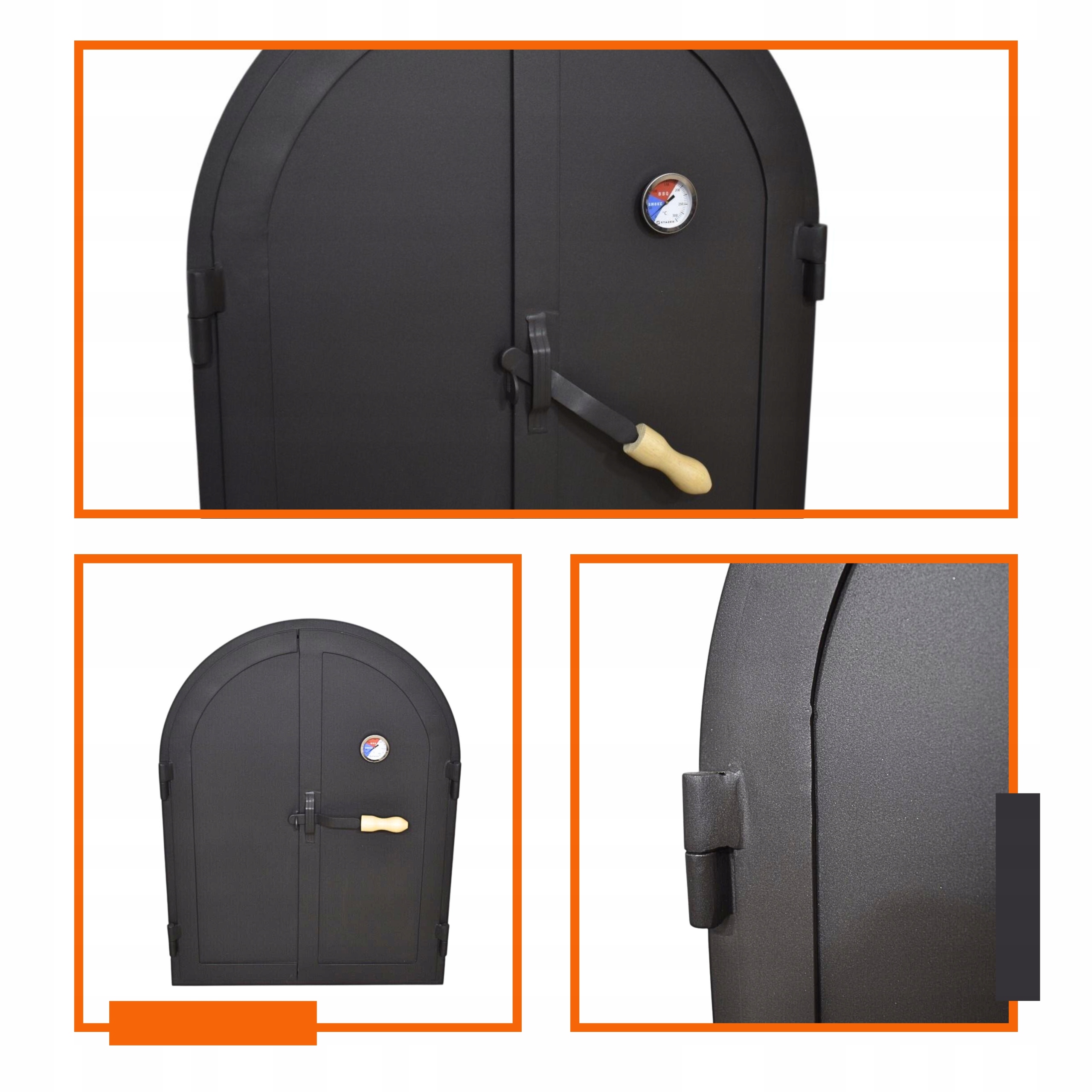 Массивные стальные двери коптильни классической арочной формы, обогащенные простыми рельефами, которые придают им элегантный и искусный характер. Изготовленные полностью из стали толщиной 2 мм и смонтированные на прочном каркасе, они обеспечивают долговечность и устойчивость к интенсивному использованию.