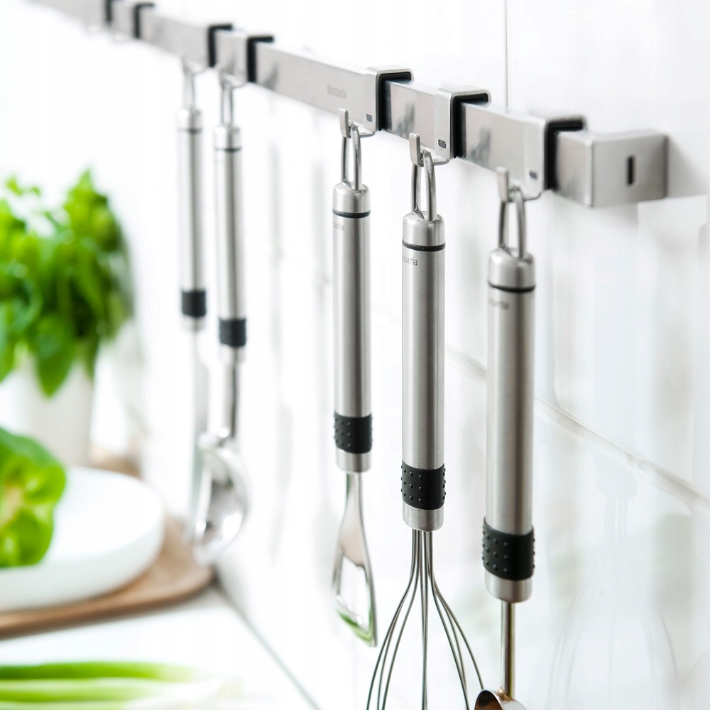 Оснащен эргономичной ручкой, которая устойчиво лежит в руке. Заканчивается петелькой для подвешивания на кухонную рейку вместе с другой утварью серии Profile.