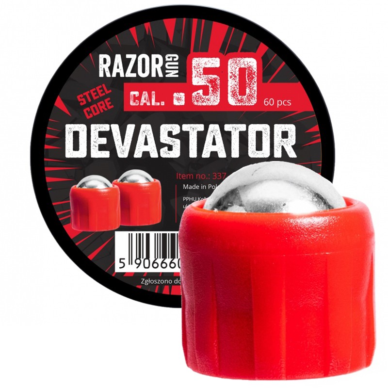 RazorGun Steel Core Devastator — специальные пули для револьвера T4E HDR 50, характеризующиеся отличной пробиваемостью и повышенной нокдауном. Они состоят из двух элементов: пластикового стабилизирующего челнока (башмака) и стального шарика, встроенного в верхнюю часть башмака.