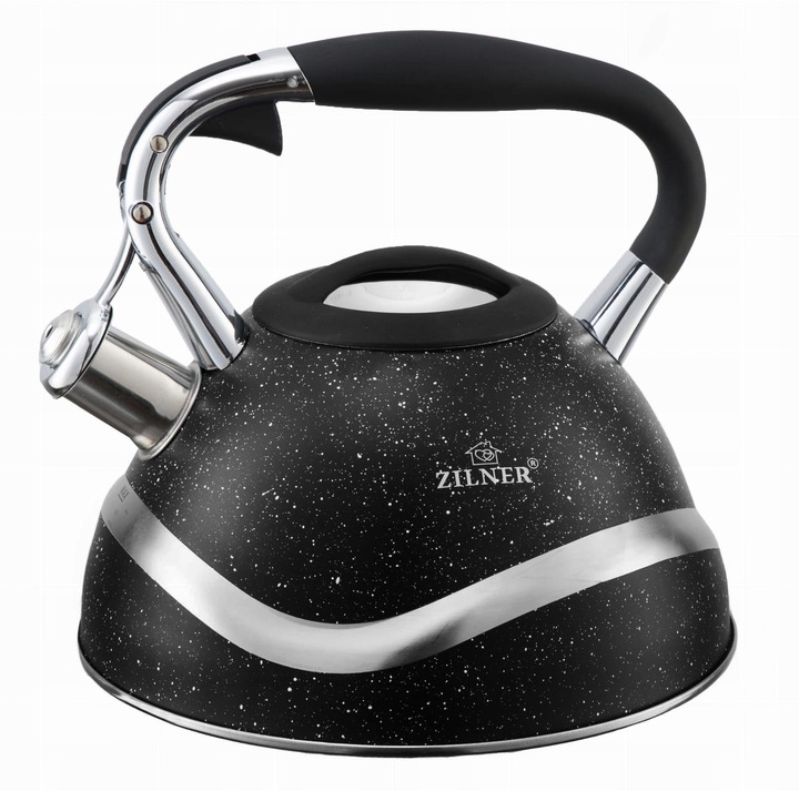 Качественный чайник ZILNER емкостью 3 литра со свистком, опускаемым с помощью специального механизма, расположенного в ручке. Идеально подходит для индукционных, керамических, газовых или электрических плит.