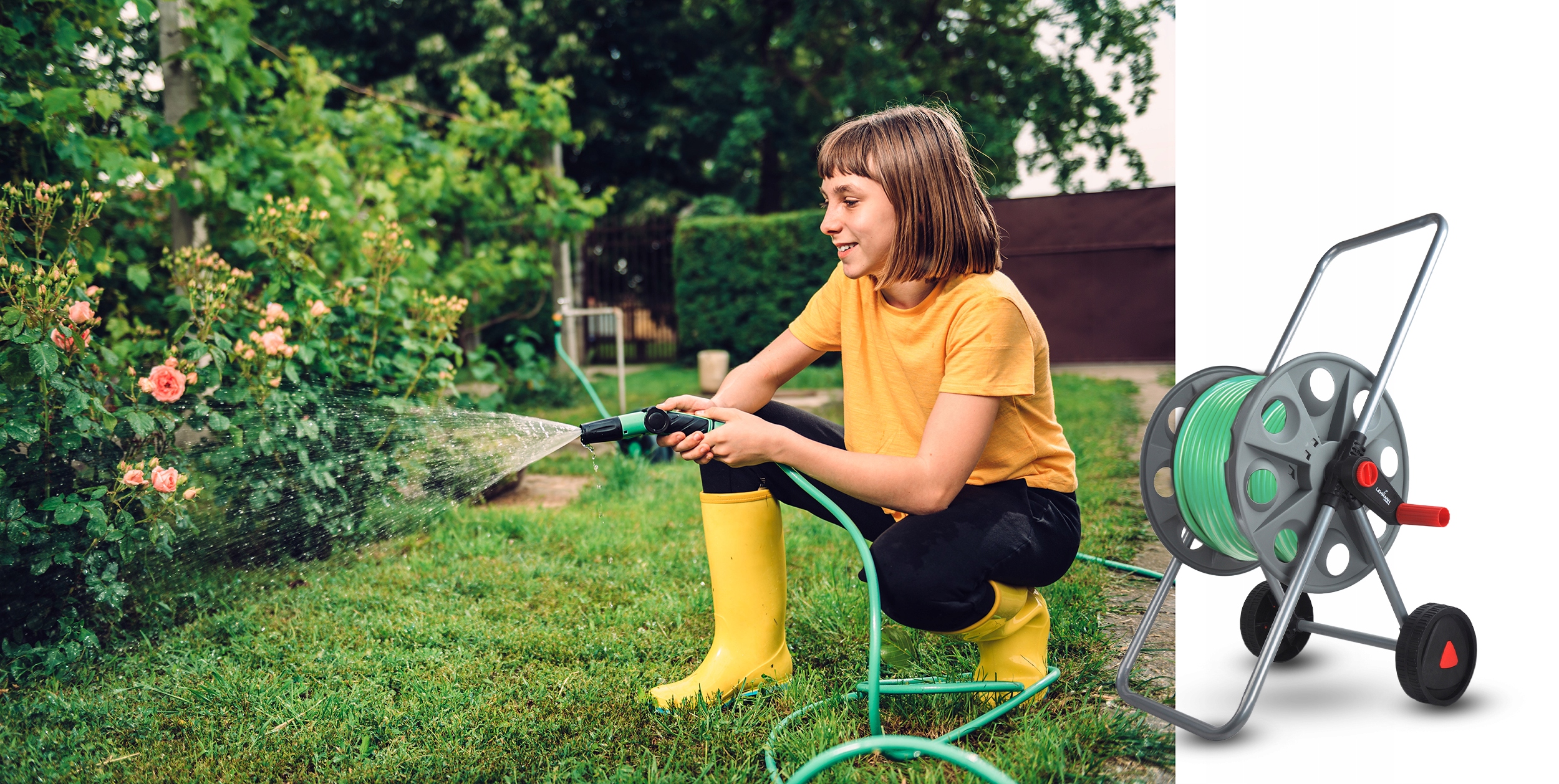 - Тележка гарантирует удобное хранение шланга. Благодаря этому шланг у нас всегда под рукой, мы можем удобно использовать его там, где нам нужно.
