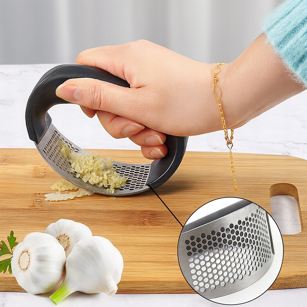 ➡️ Чесночница — практичный инструмент, который подойдет на любой кухне. Изготовленный из нержавеющей стали, он эффективно измельчает и измельчает чеснок, а удобная пластиковая ручка обеспечивает комфорт использования.