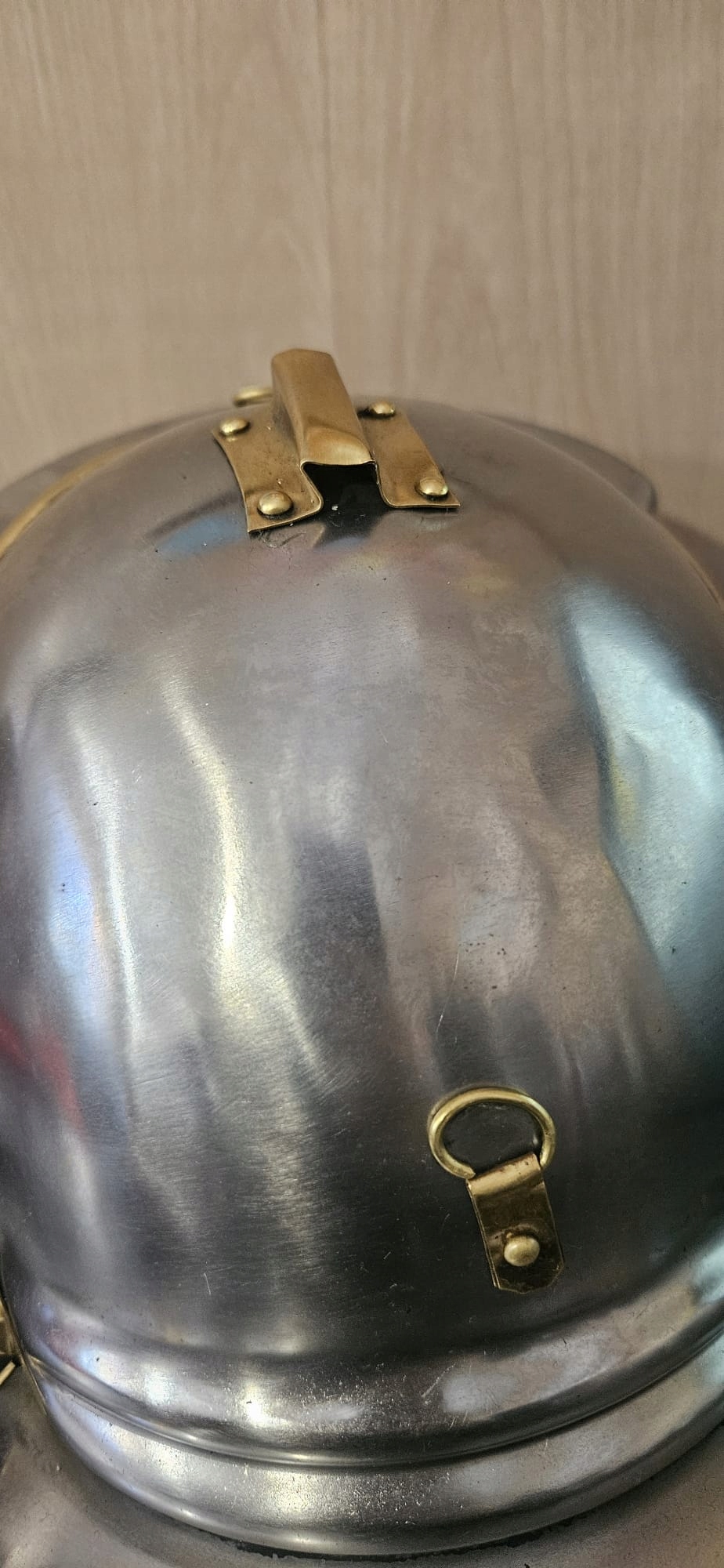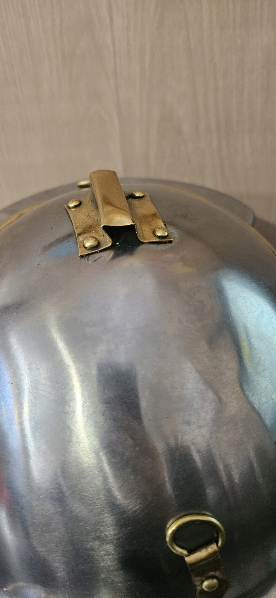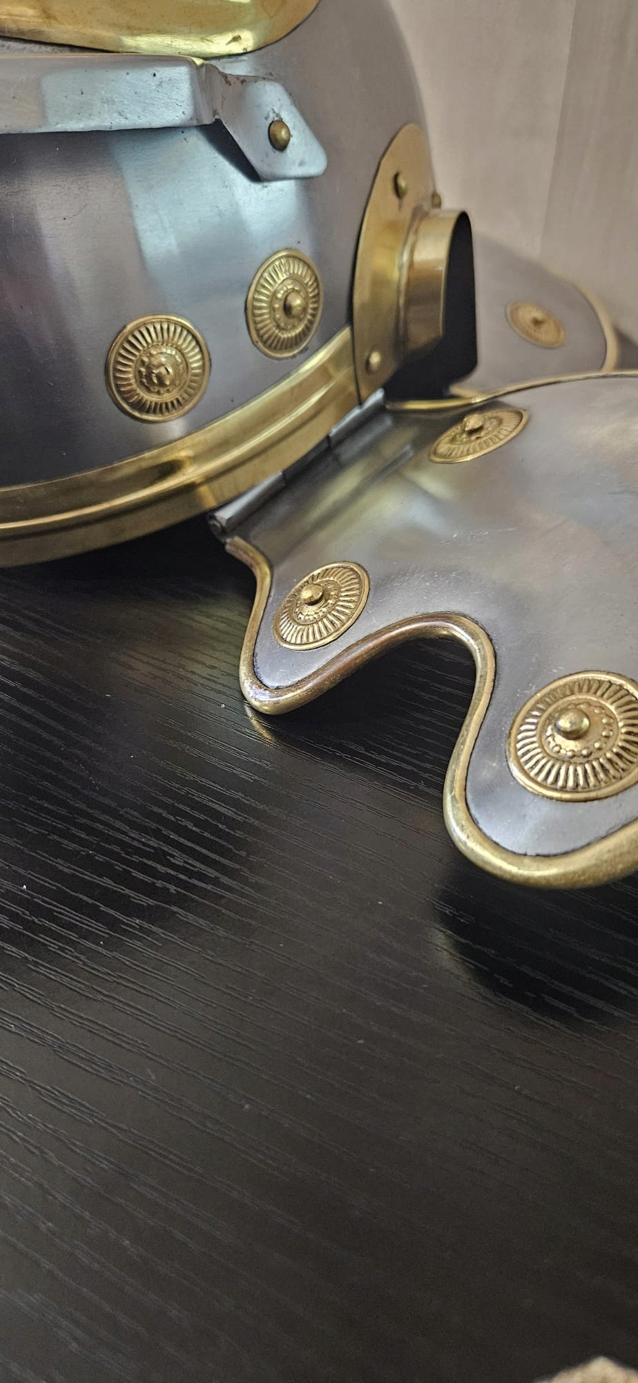 Этот настоящий шлем римского легионера (Галеа) представляет собой точную копию I века нашей эры, изготовлен из полированной углеродистой стали и украшен латунными деталями - символом силы и мужества древних воинов. ️