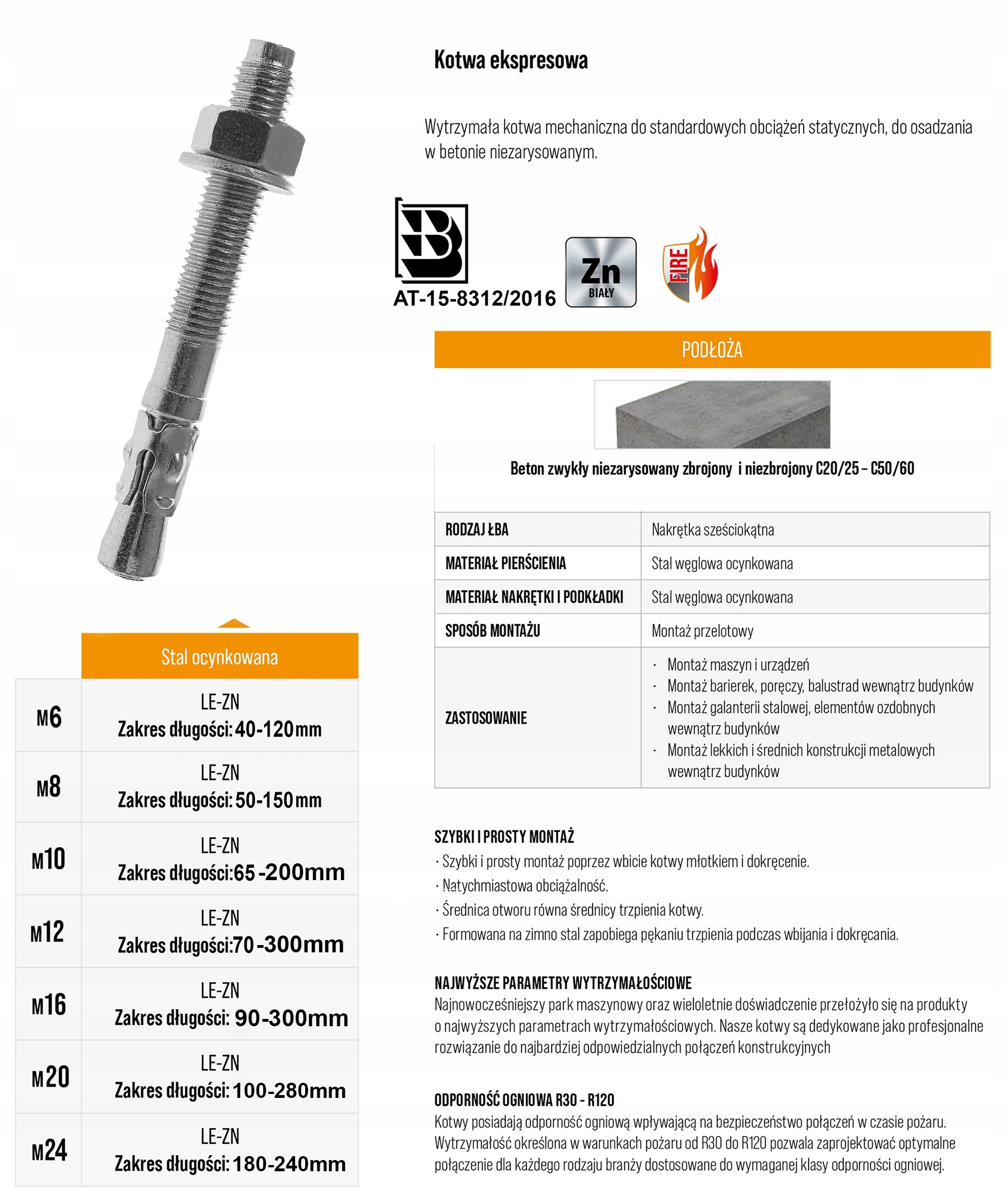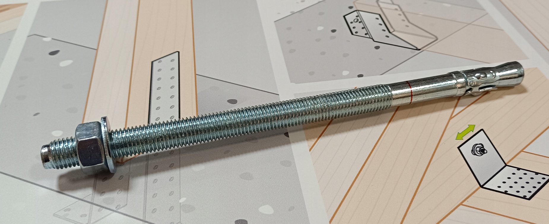 Состоит из резьбового штифта с разжимным конусом, распорной ленты, шестигранной гайки и шайбы. Он изготовлен из низкоуглеродистой стали и покрыт слоем цинка, обеспечивающим антикоррозионную защиту. Крепление осуществляется путем затягивания гайки с соответствующим крутящим моментом, что приводит к перемещению расширительной ленты и созданию постоянного крепления к основанию.
