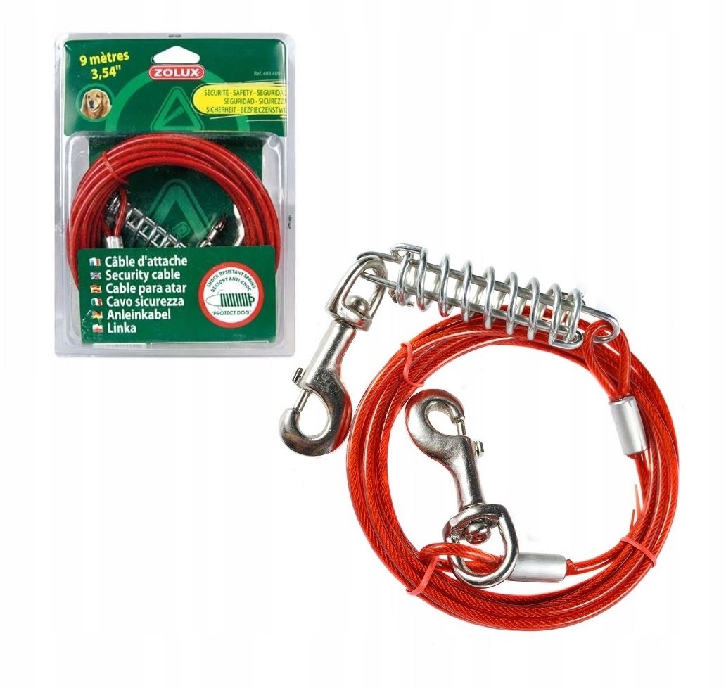 Очень прочный стальной трос с покрытием и амортизатором, прекрасно заменяющий традиционную цепь. Веревка незаменима, например, во время отпуска, когда необходимо привязать собаку, когда мы хотим отдохнуть, давая собаке свободу передвижения, не теряя при этом контроля над своим местонахождением.