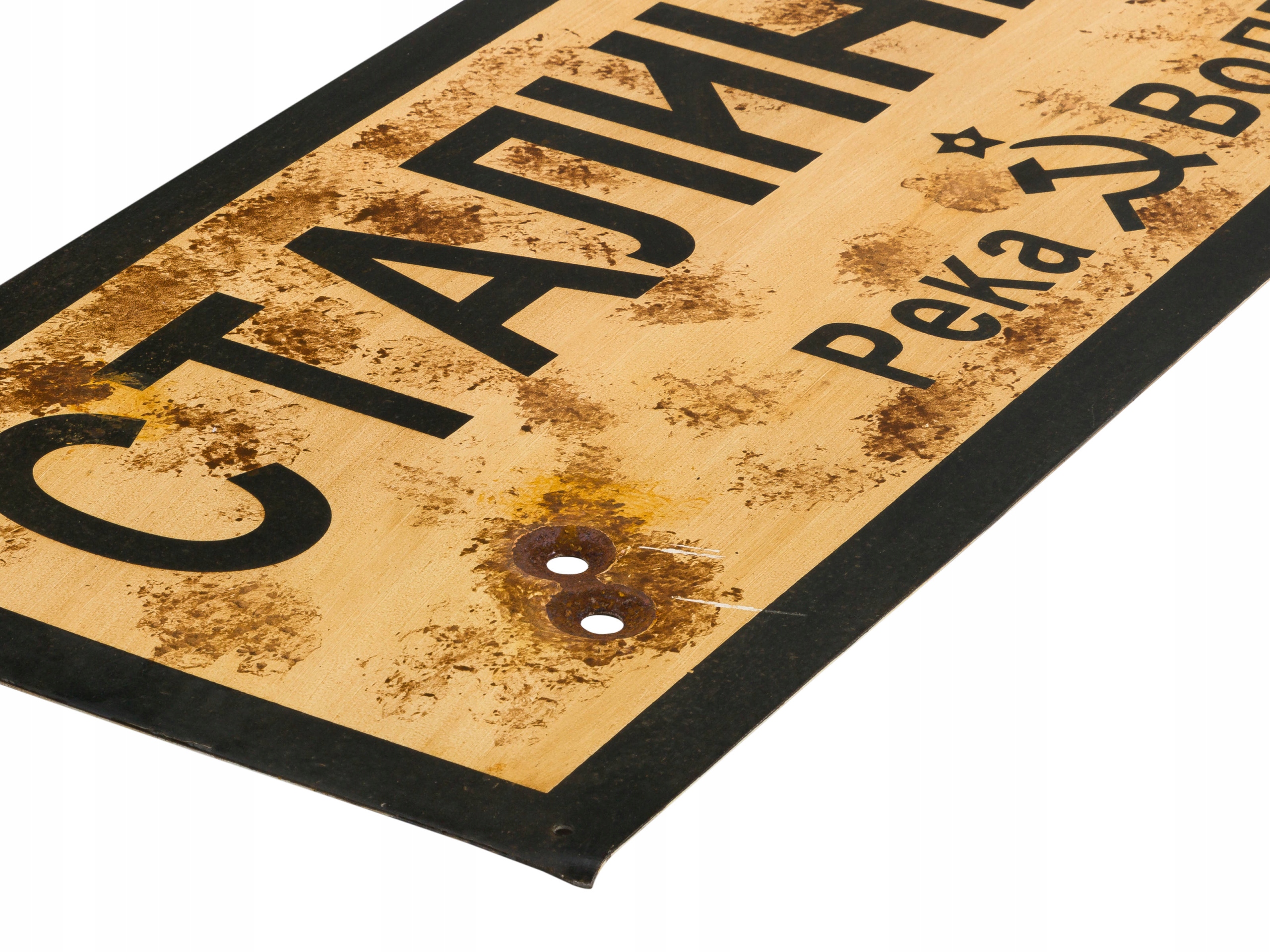 Старинная копия дорожного знака с названием города Сталинграда. Надпись на русском языке - Сталинград. Знак изготовлен из толстого прочного стального листа. Вывеска под старину - имеет отверстия, напоминающие пулевые отверстия, местами облупилась краска, ржавчина и т.д. 4 дополнительных отверстия по краям позволяют установить вывеску.