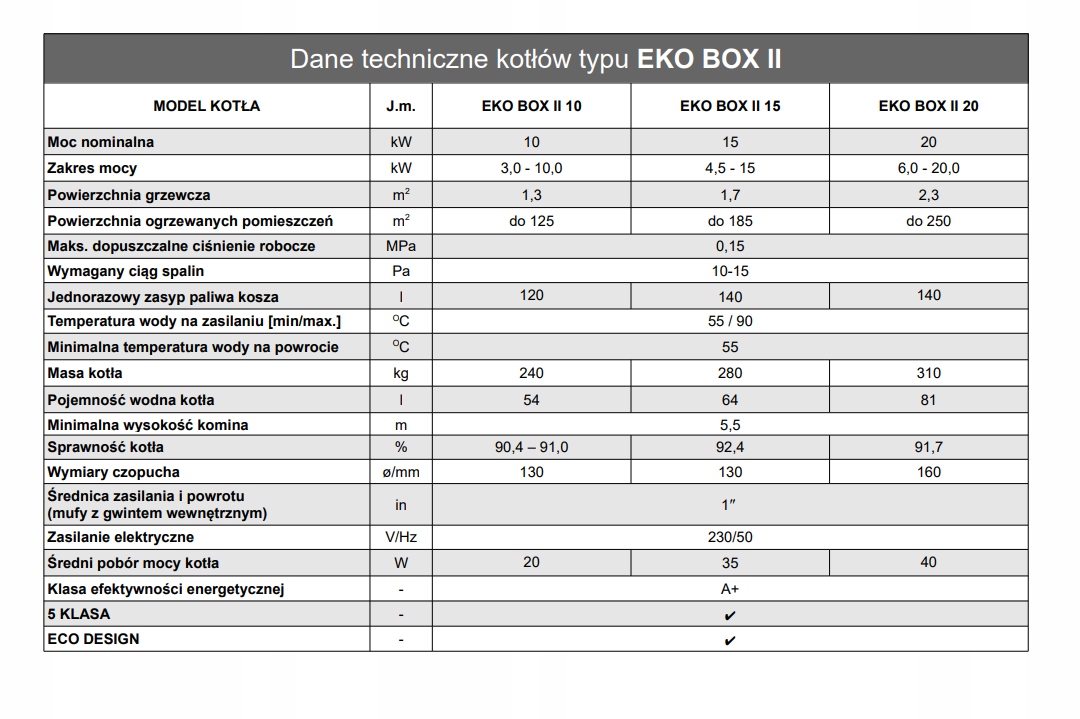 . Box II является идеальным выбором для пользователей, которые ценят комфорт и чистоту в котелке. котел был построен с видом на маленькие и плотные котлы. Конструкция котла со встроенным резервуаром для гранул и автоматического питателя от 60 до 230 м2. котел -гранулы был оснащен самостоятельным горелкой и самоуверенным теплообменником, который обеспечивает комфортное использование центрального нагревательного котла. С минимальным обслуживанием. встроенный в бак пеллета емкость составляет 120 литров до 140 литров в зависимости от мощности котла. котел Eco Box II был оснащен контроллером, который позволяет подключать пять насосов отопления и два смешанных клапана. Электроника может быть расширена путем управления котлом через Интернет или подключить регулятор комнаты.