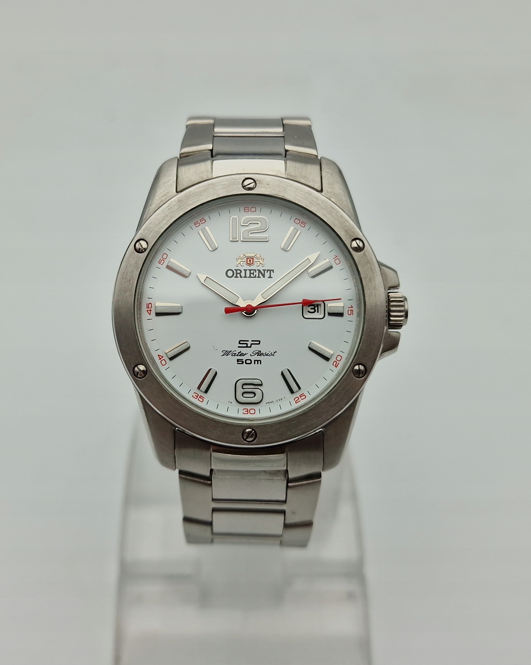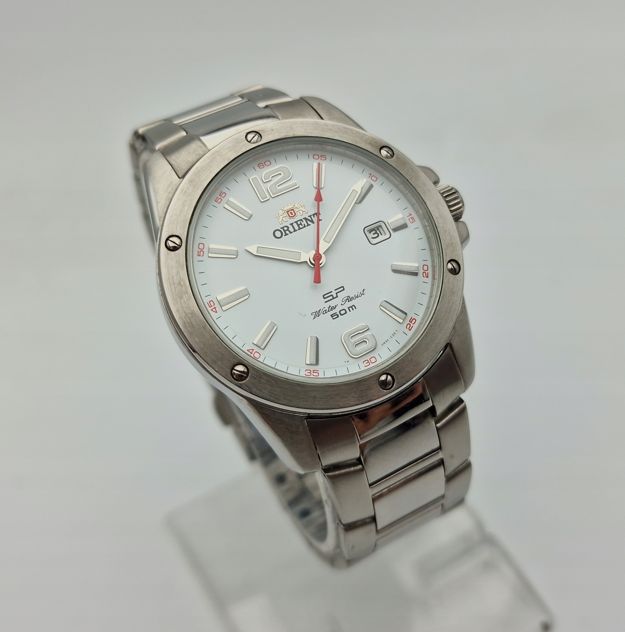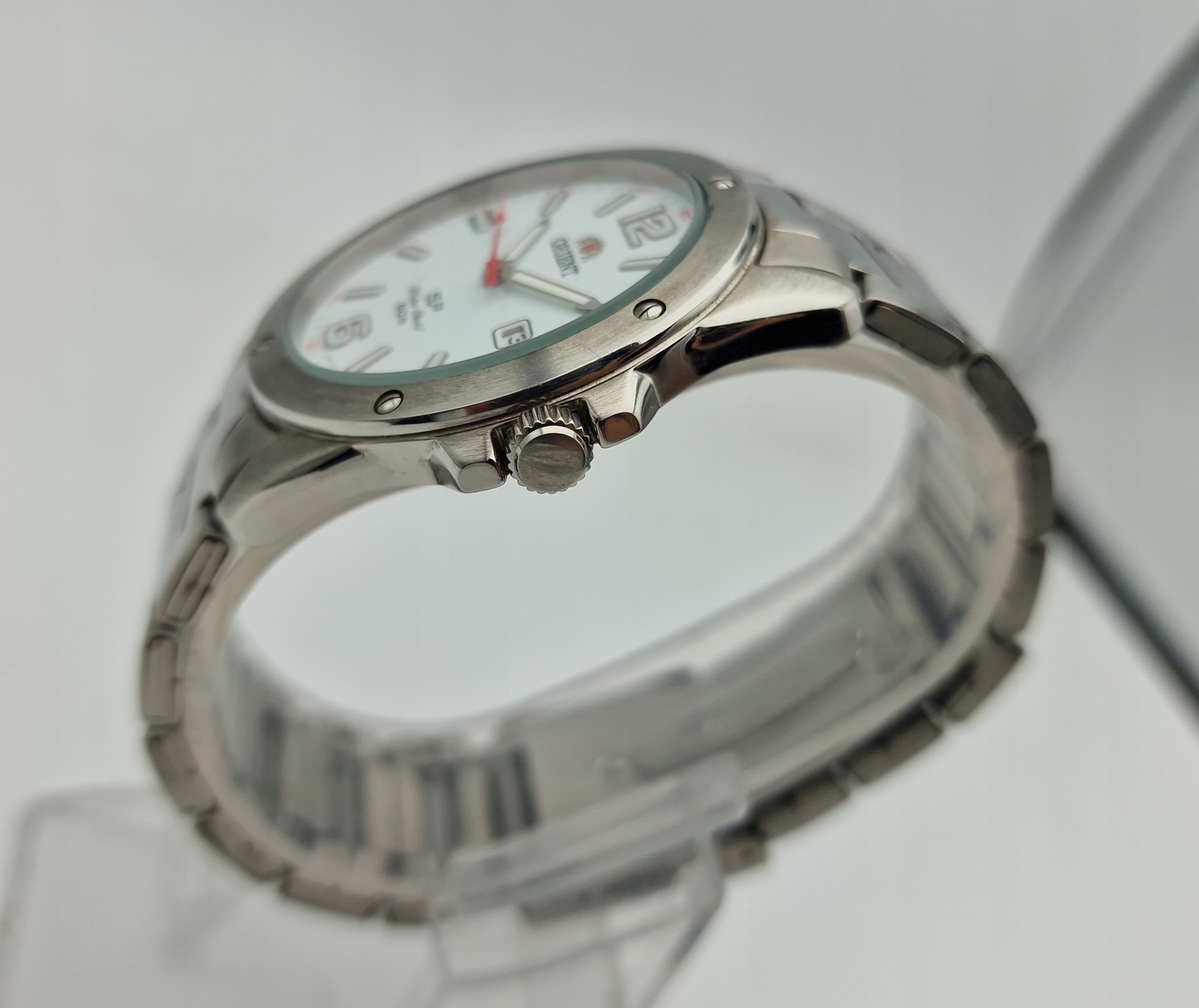 - Белый циферблат со светящимися часовыми метками и указателем даты в положении «три часа». На циферблате написано: «ORIENT SP, WATER RESIST 50M». Циферблат в идеальном состоянии, как показано на аукционных фотографиях.