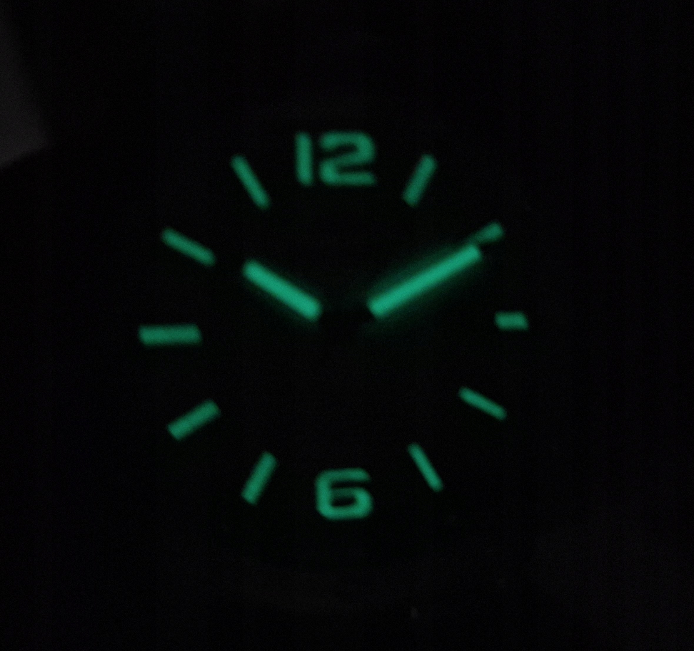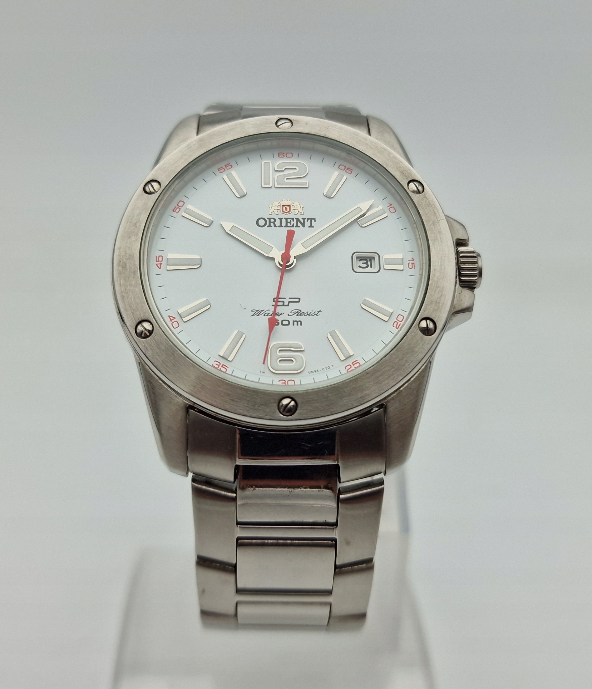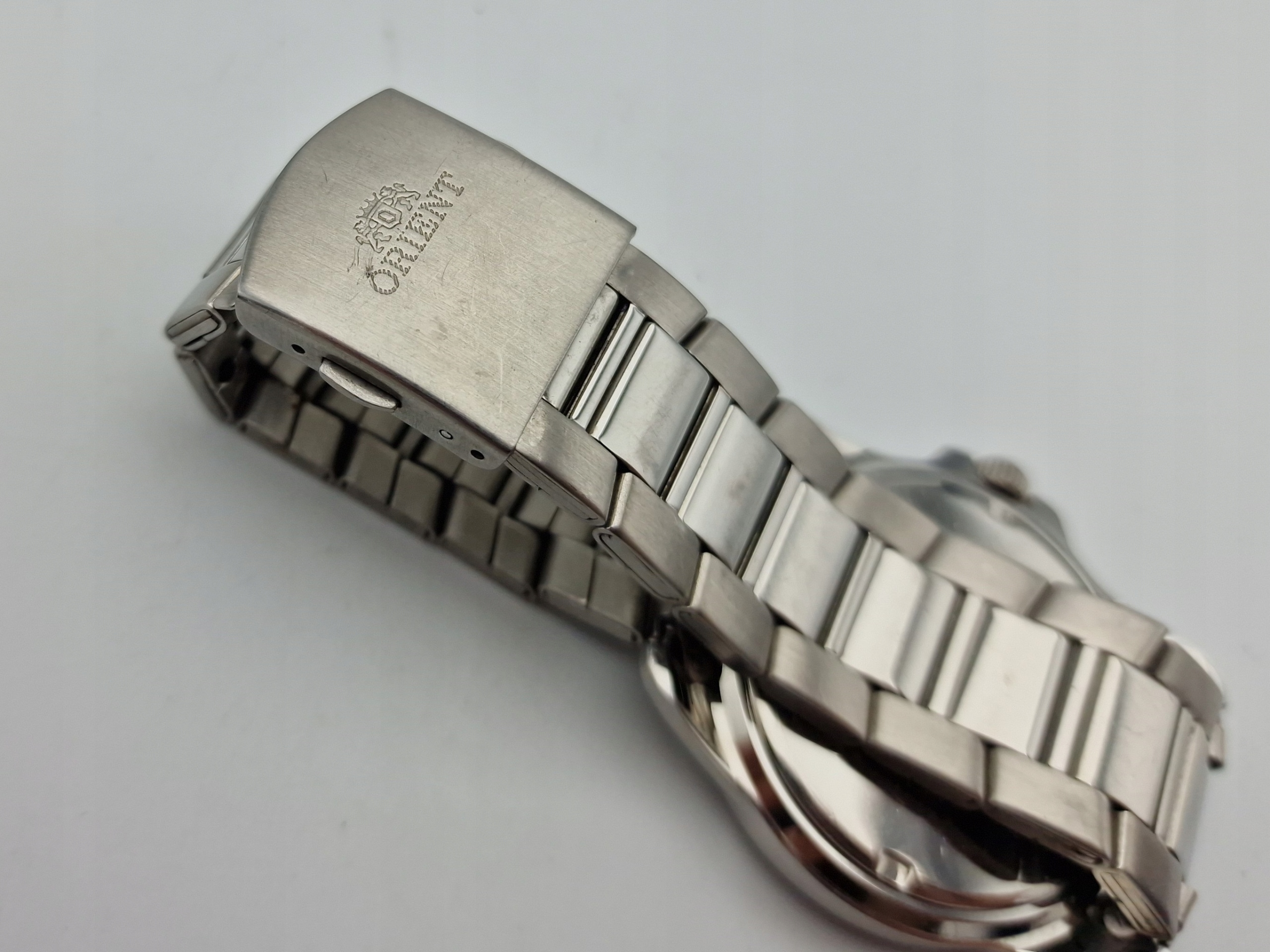 - Белый циферблат со светящимися часовыми метками и указателем даты в положении «три часа». На циферблате написано: «ORIENT SP, WATER RESIST 50M». Циферблат в идеальном состоянии, как показано на аукционных фотографиях.
