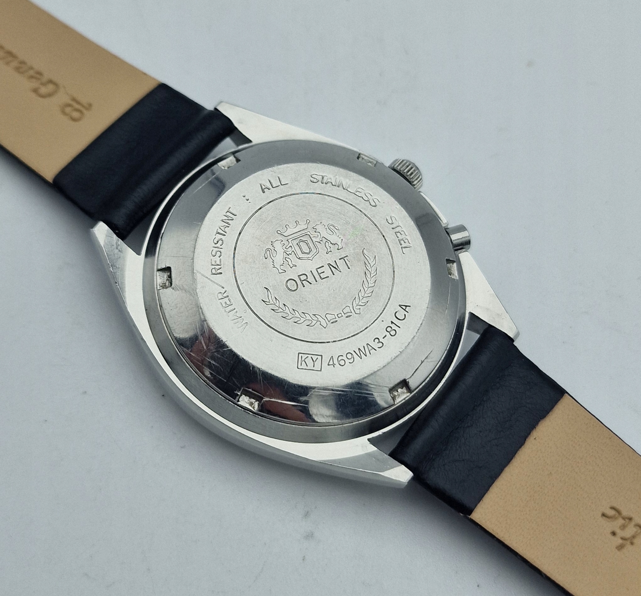 - Стальной корпус. Задняя крышка, прикрученная, подписана надписью: «ВОДОНЕПРОНИЦАЕМОСТЬ, ВСЕ НЕРЖАВЕЮЩАЯ СТАЛЬ, ORIENT». Оригинальное кружево в идеальном состоянии. Состояние корпуса практически идеальное, как показано на фотографиях.