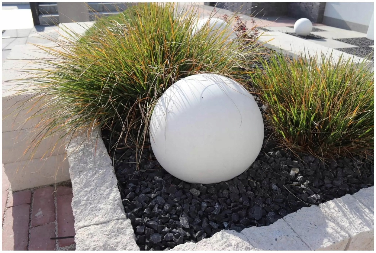 - Он идеально впишется в современные композиции. Интригующе смотрится на контрасте с зеленью, высокой травой или в сочетании с модной, крупной тротуарной плиткой.