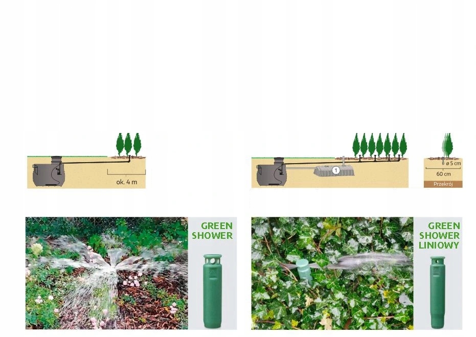 Благодаря использованию запатентованных линейных разбрызгивателей GREEN SHOWER данная система позволяет использование очищенных сточных вод для орошения растений, расположенных в разных частях сада. Вы можете спроектировать, например, прямой, круговой или другой полив.