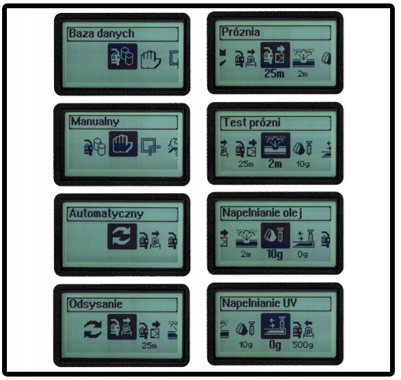 - Ручной режим- позволяет вам ввести все параметры, такие как вакуум, количество нефти и количества газовых человеческих, благодаря этому режиму. - Позволяет весь процесс обслуживания в автоматическом режиме