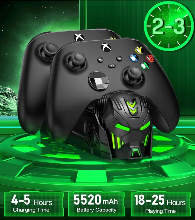 【2*5520MWH Батарея для контроллера Xbox】 Набор включает в себя 2 батареи с емкостью 5520 мл. Чид-ч для контроллера Xbox One, что обеспечивает 18-25 часов игры и требует всего 4 часа зарядки. Благодаря двум батареям и увеличению емкости аккумулятора, чтобы продлить игровое время и никогда не пропустить ни секунды игры (помните, что батареи находятся на дне док -станции).