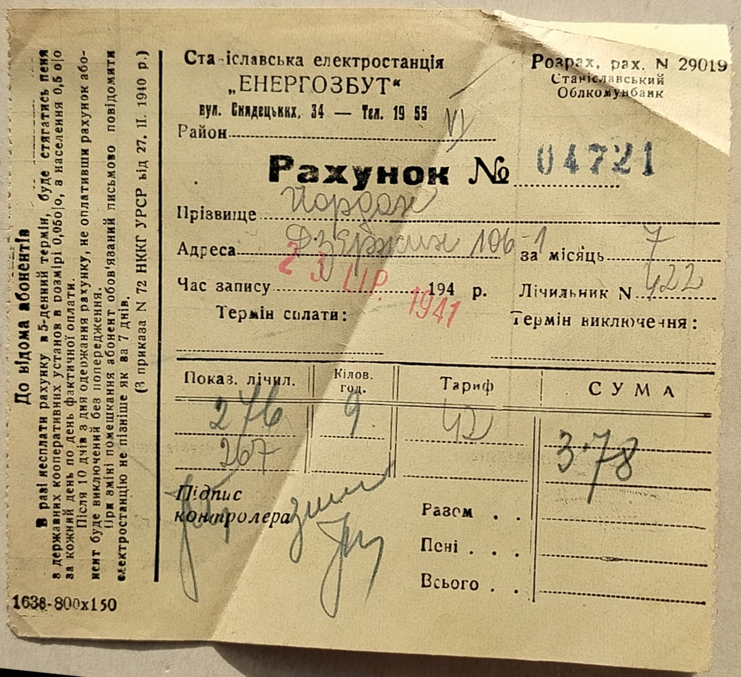 Квитанция за потребленную электроэнергию на бланке периода Второй мировой войны. Текст на украинском языке. Муниципальная электростанция - ЭНЕРГОЗБЫТ в Станиславове. За 4 кВтч по тарифу а' 42 было заплачено 3,78 злотых [PLN ?]. Датировано 23 июля 1941 г., Текст на одной стороне, размер 13х13 см, хорошее состояние.[квитанция напечатана на оборотной стороне ранее использованного бланка на польском языке][ СТАНИСЛАВОВ ] [ ЭЛЕКТРОСТАНЦИЯ ][ КРЕСЫ ] [ ВТОРАЯ МИРОВАЯ ВОЙНА ] [ БИЛЛ ] 1210E