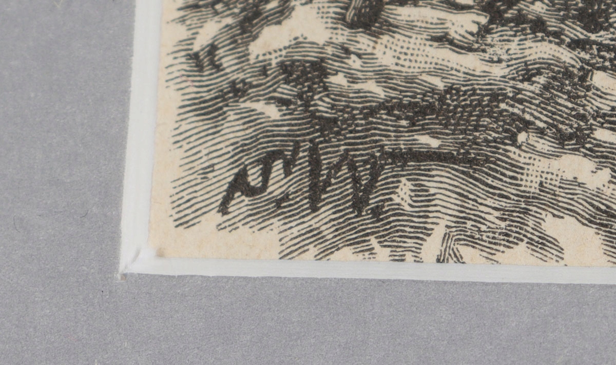 Техника: хранить деревянную кванию/бумагу. Работа подписана на блоке с монограммой в левом нижнем углу.