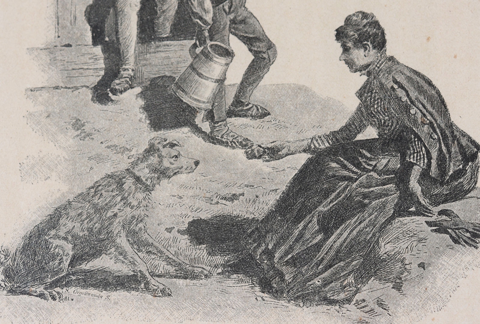 На изображении городская туристка, кормящая собаку перед дачей горца