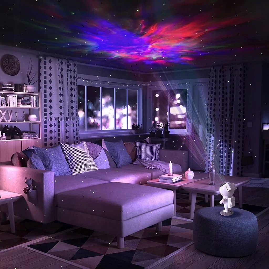 Использование лампы космонавта исключительно просто и интуитивно понятно. Для управления проектором используйте многофункциональный пульт дистанционного управления, входящий в комплект. С с его помощью вы можете настроить такие параметры, как яркость туманности и звезд, скорость вращения и выбрать один из 8 различных режимов освещения. Изображение, отображаемое лампой космонавта, можно легко адаптировать под свои нужды, свободно выбирая цвета и используя лазер, излучающий зеленые звезды. Для любителей космических видов доступна опция «Звездный потолок», позволяющая создать в помещении эффект звездного неба.