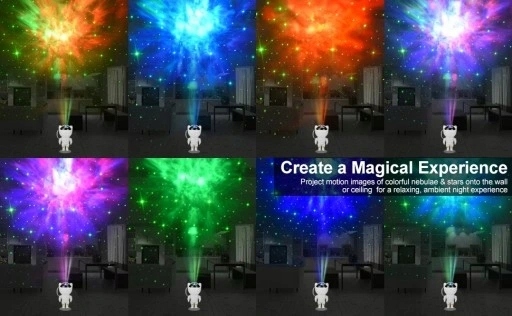 [Проектор туманности космонавта]: Наш проектор космонавта может снимать красочную и непредсказуемую туманность, имитируя настоящее звездное небо, мерцающие звезды, вызывая у вас совершенно другое мечтательное ощущение. 8 видов отображения эффекта туманности, изменение скорости, яркость туманности можно переключать с помощью пульта дистанционного управления или кнопки.
