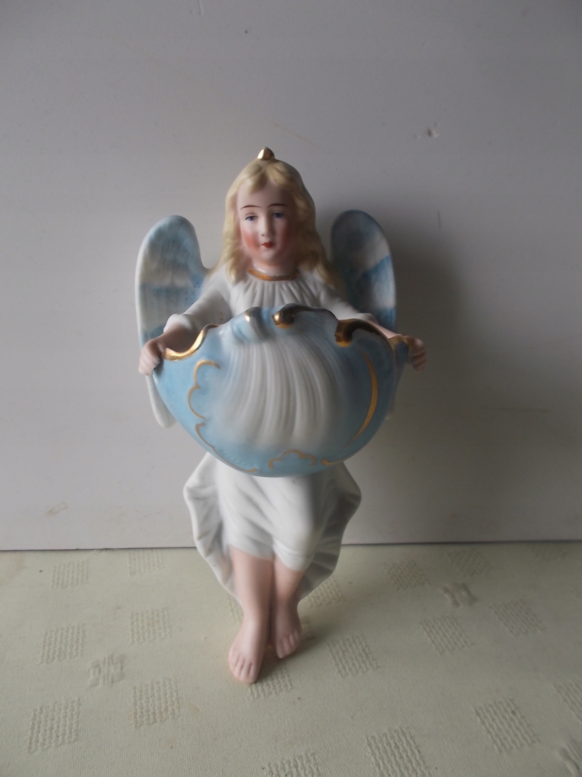 Stara, biskwitowa kropielniczka z aniołkiem.