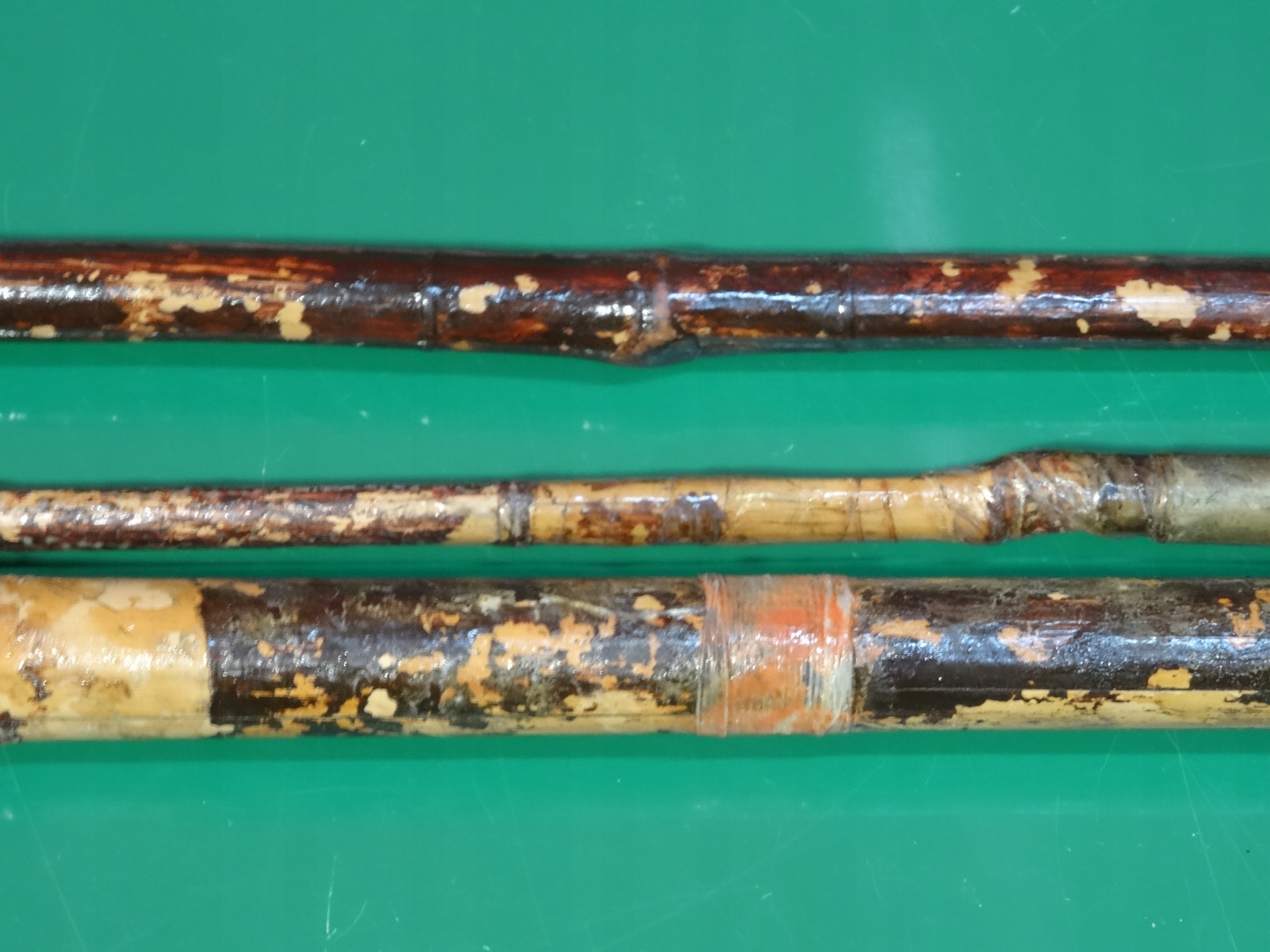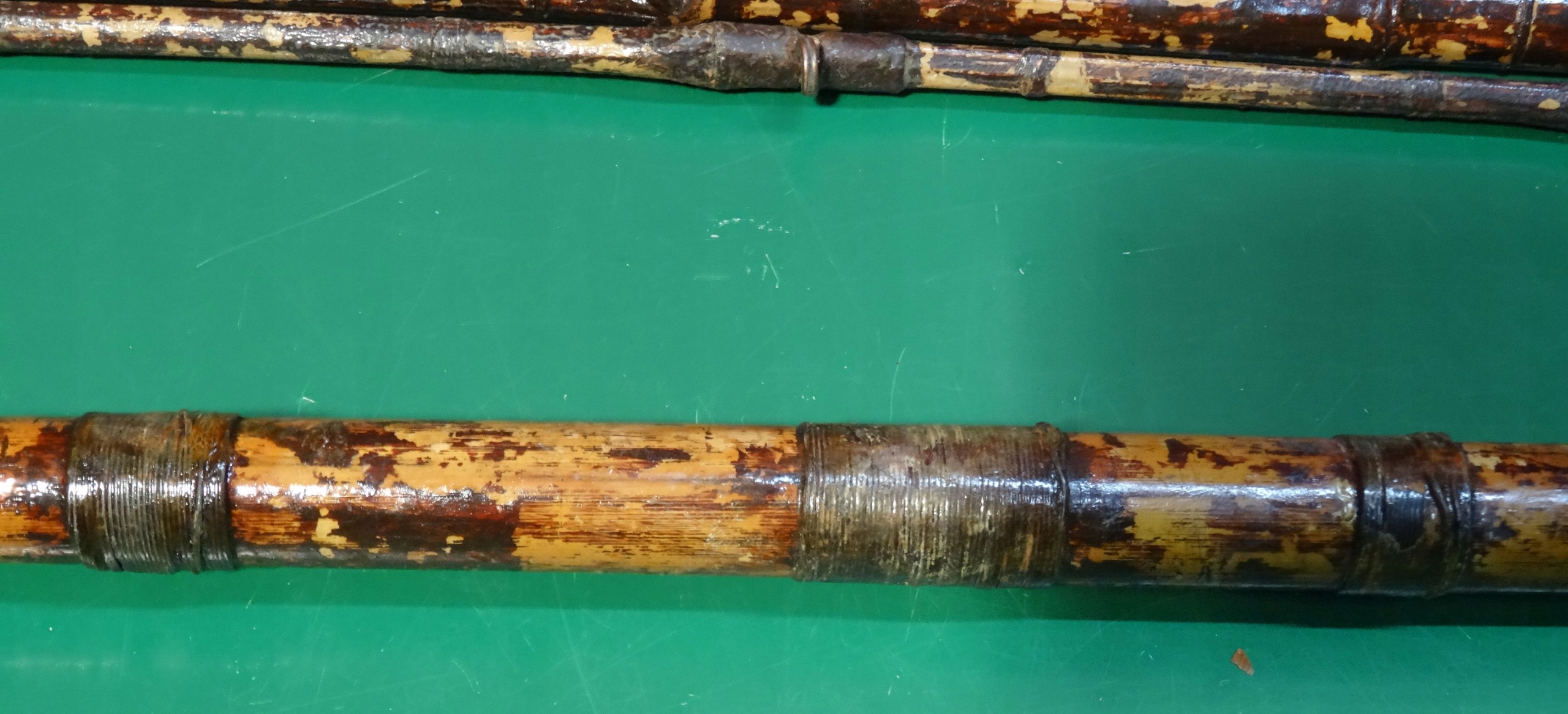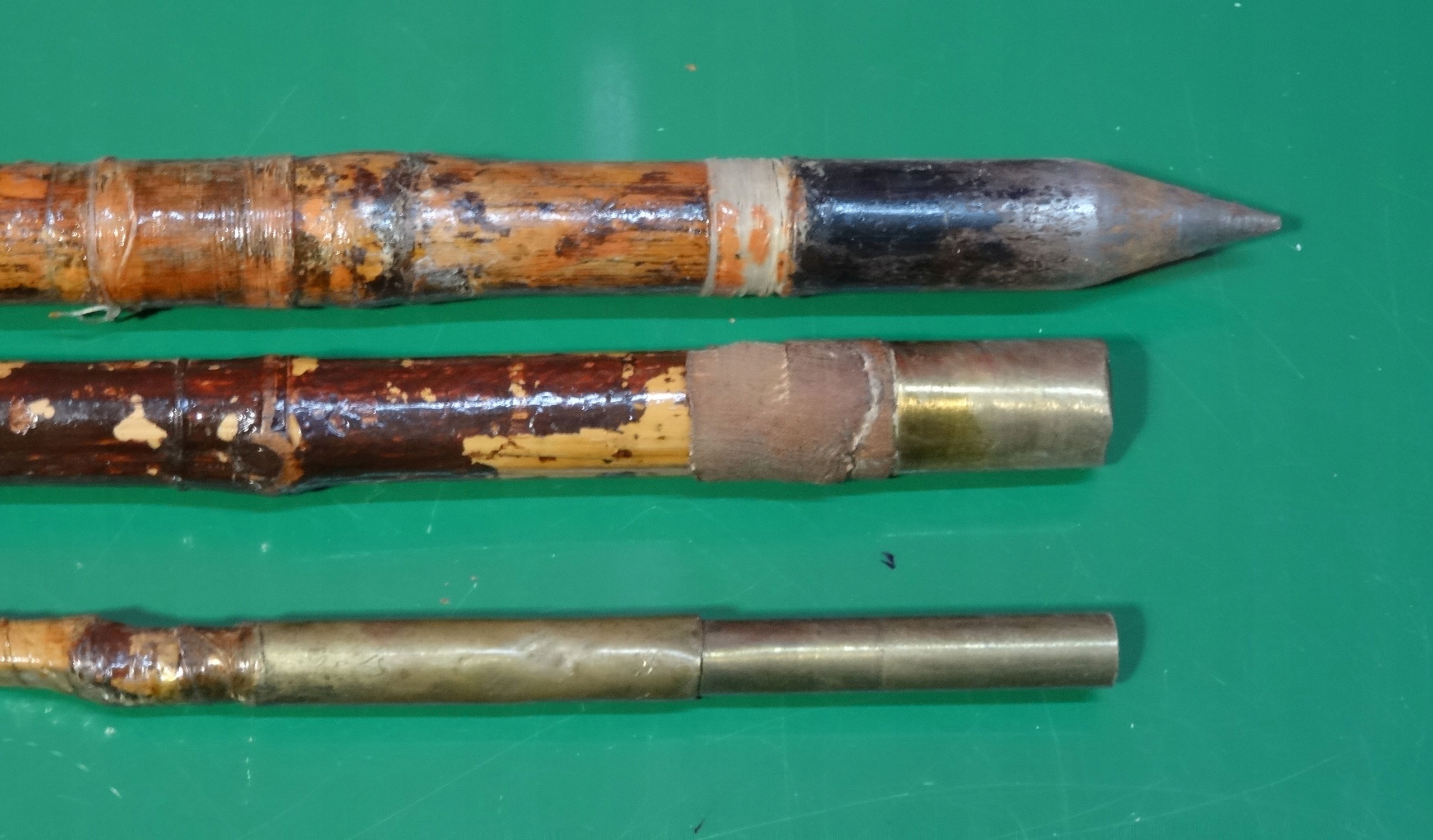 Старая бамбуковая удочка. Соединительные элементы стержня из латуни, наконечник стальной заостренный, окрашен лаком.