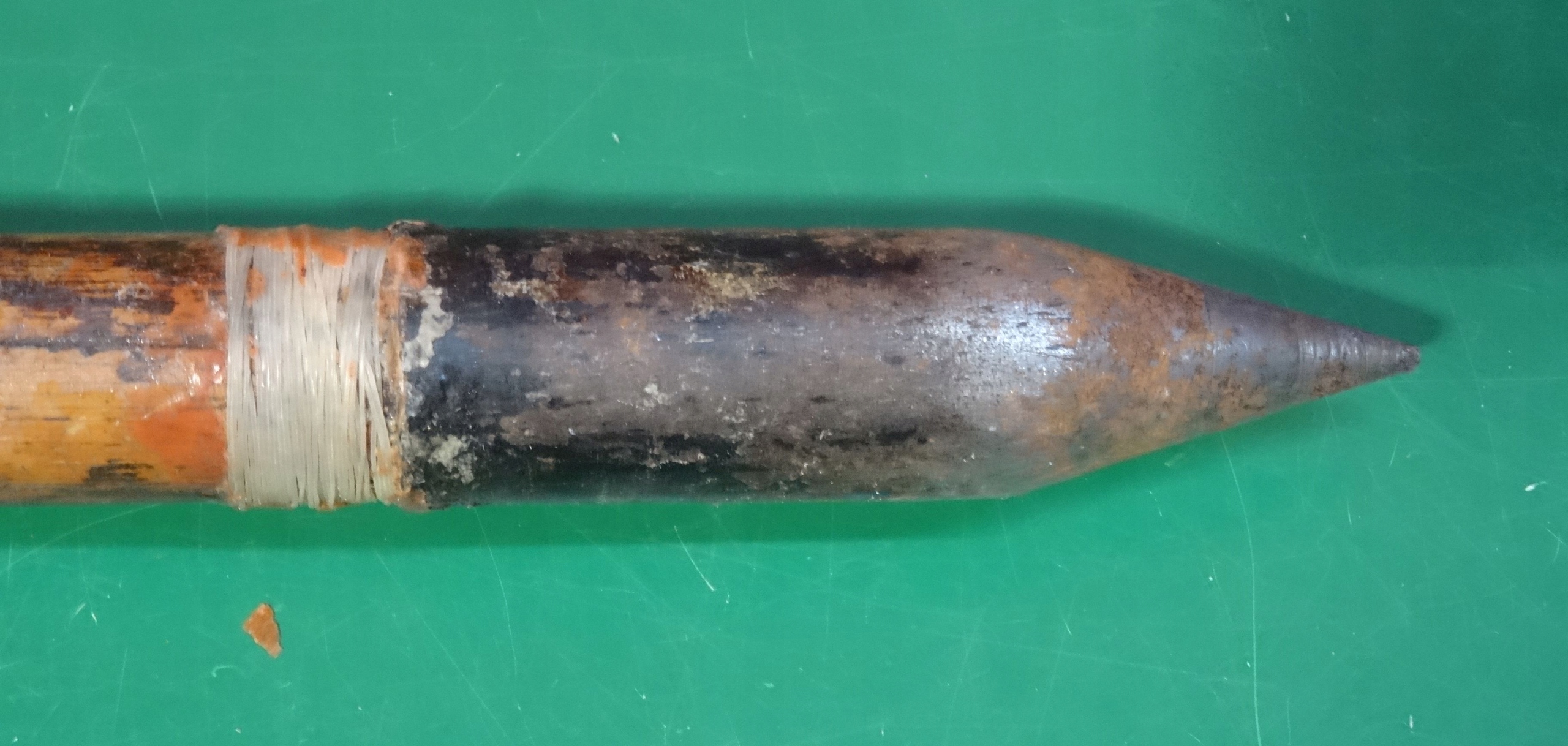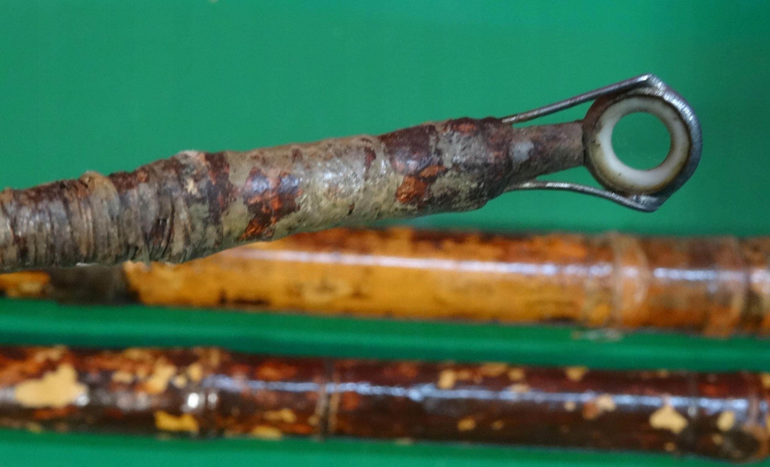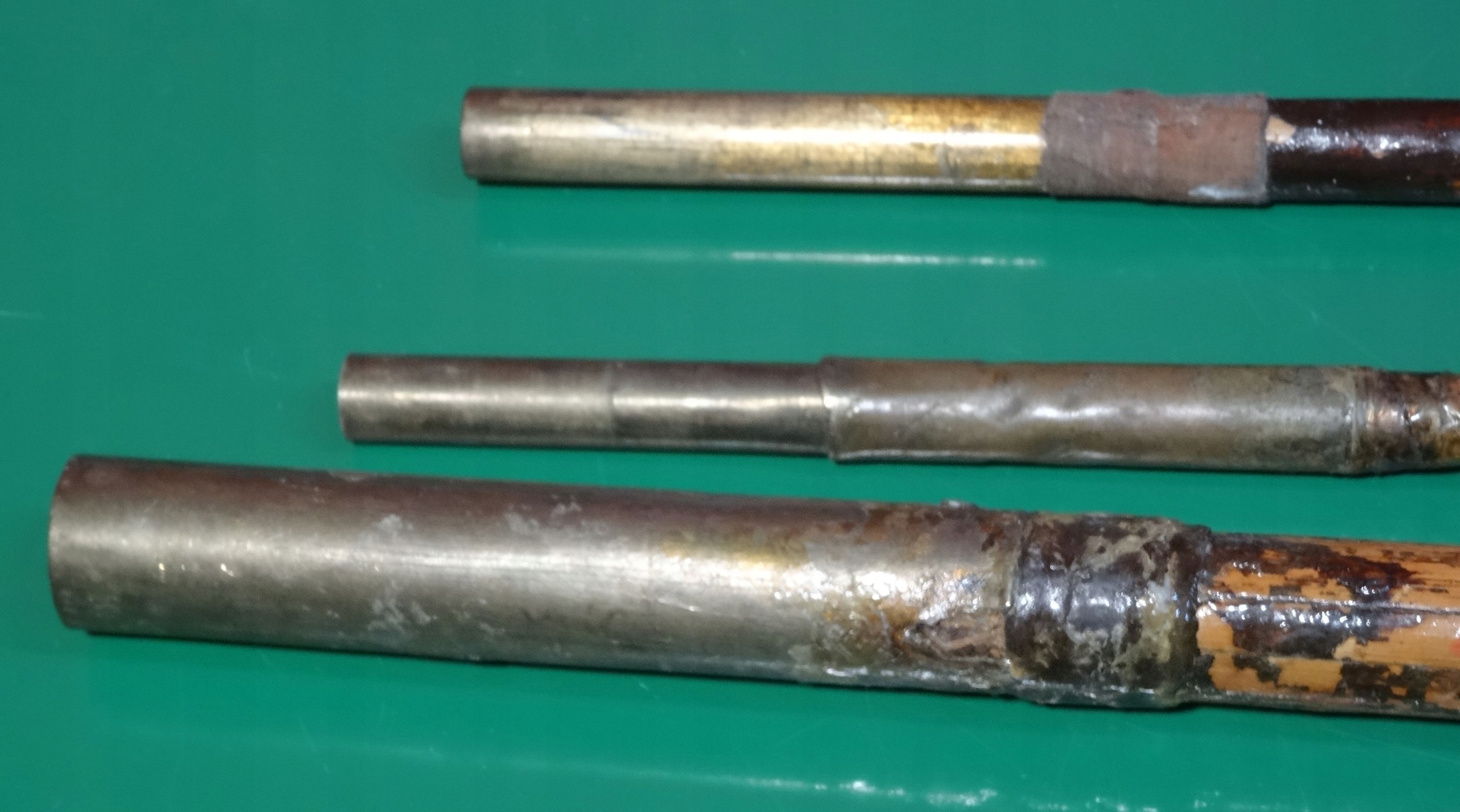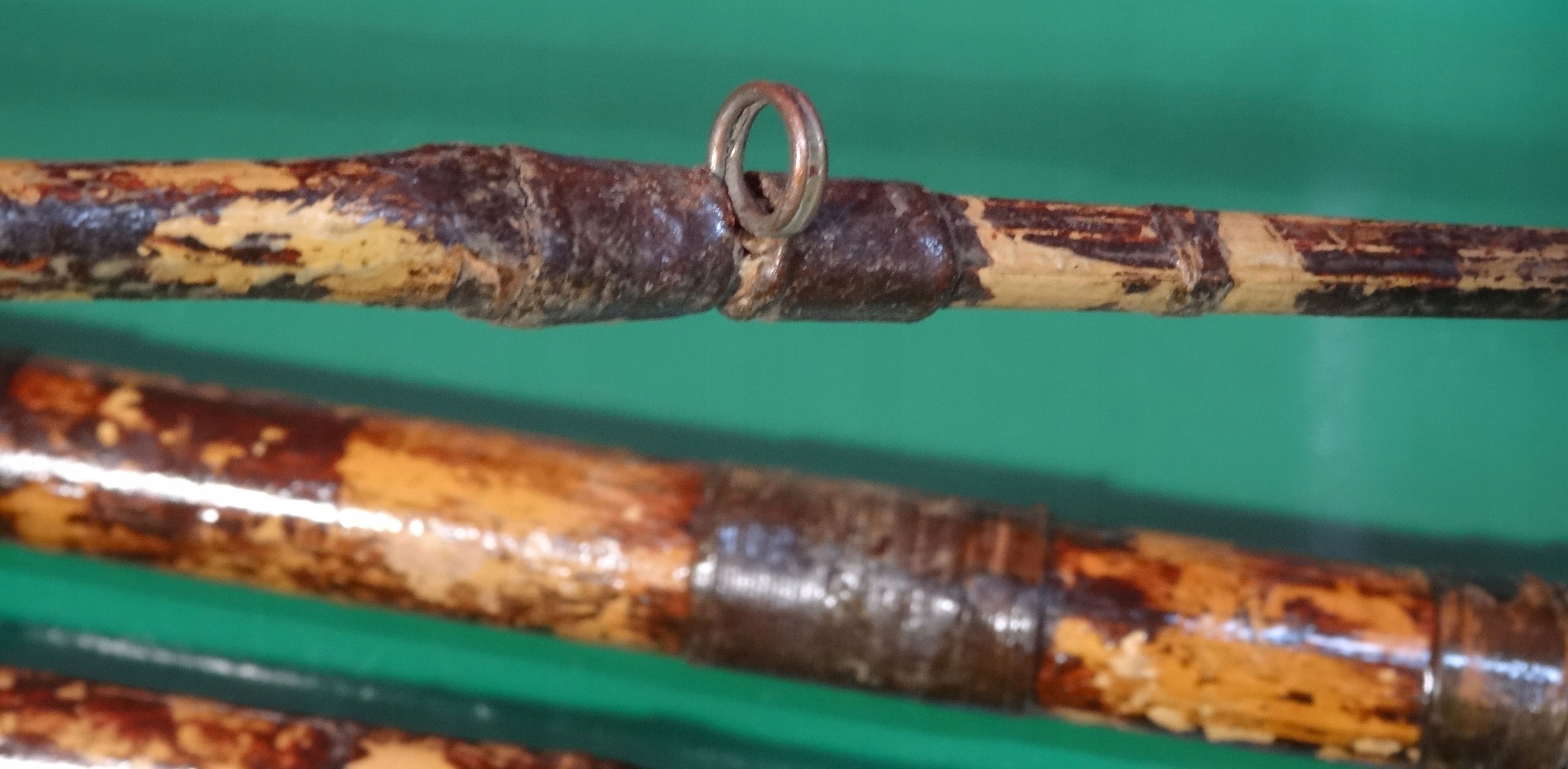 Старая бамбуковая удочка. Соединительные элементы стержня из латуни, наконечник стальной заостренный, окрашен лаком.