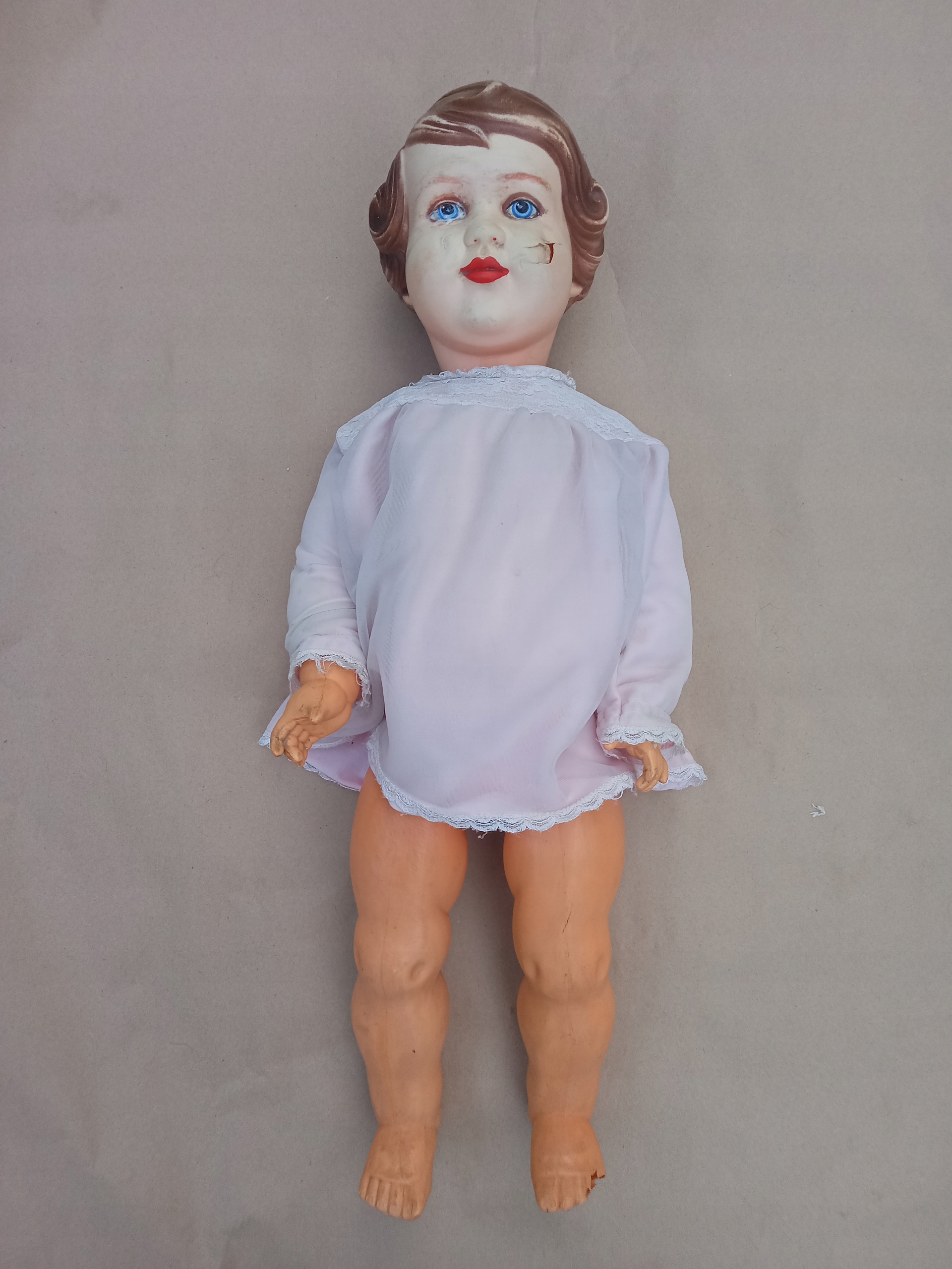Целлулоид, голова, ноги и руки прикреплены резинками, рост 67 см, повреждение лица, выцветание целлулоида, повреждение пальцев ног, небольшая вмятина на ноге, царапины и загрязнения на целлулоиде