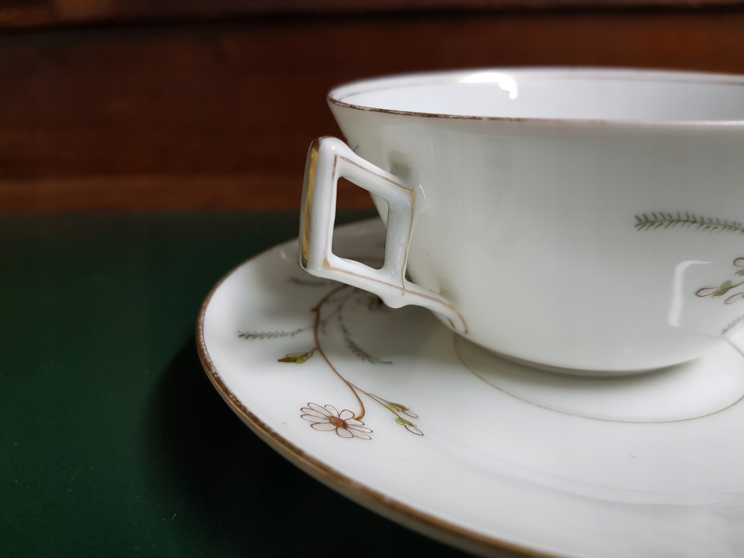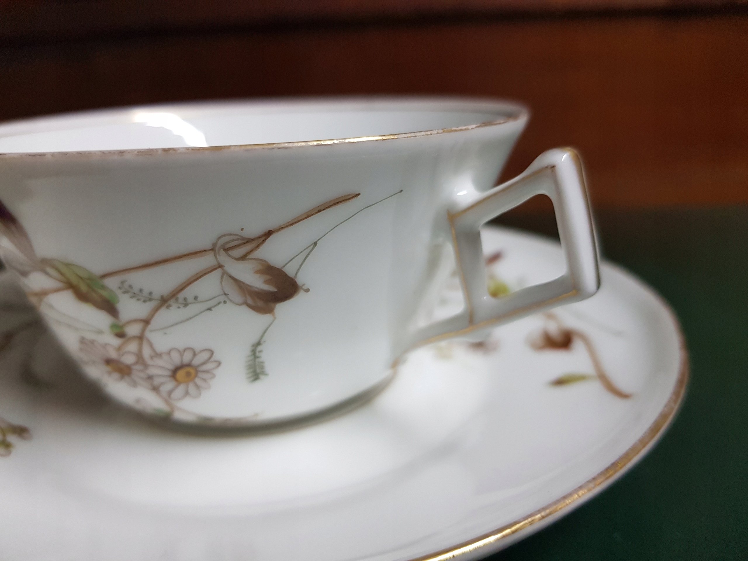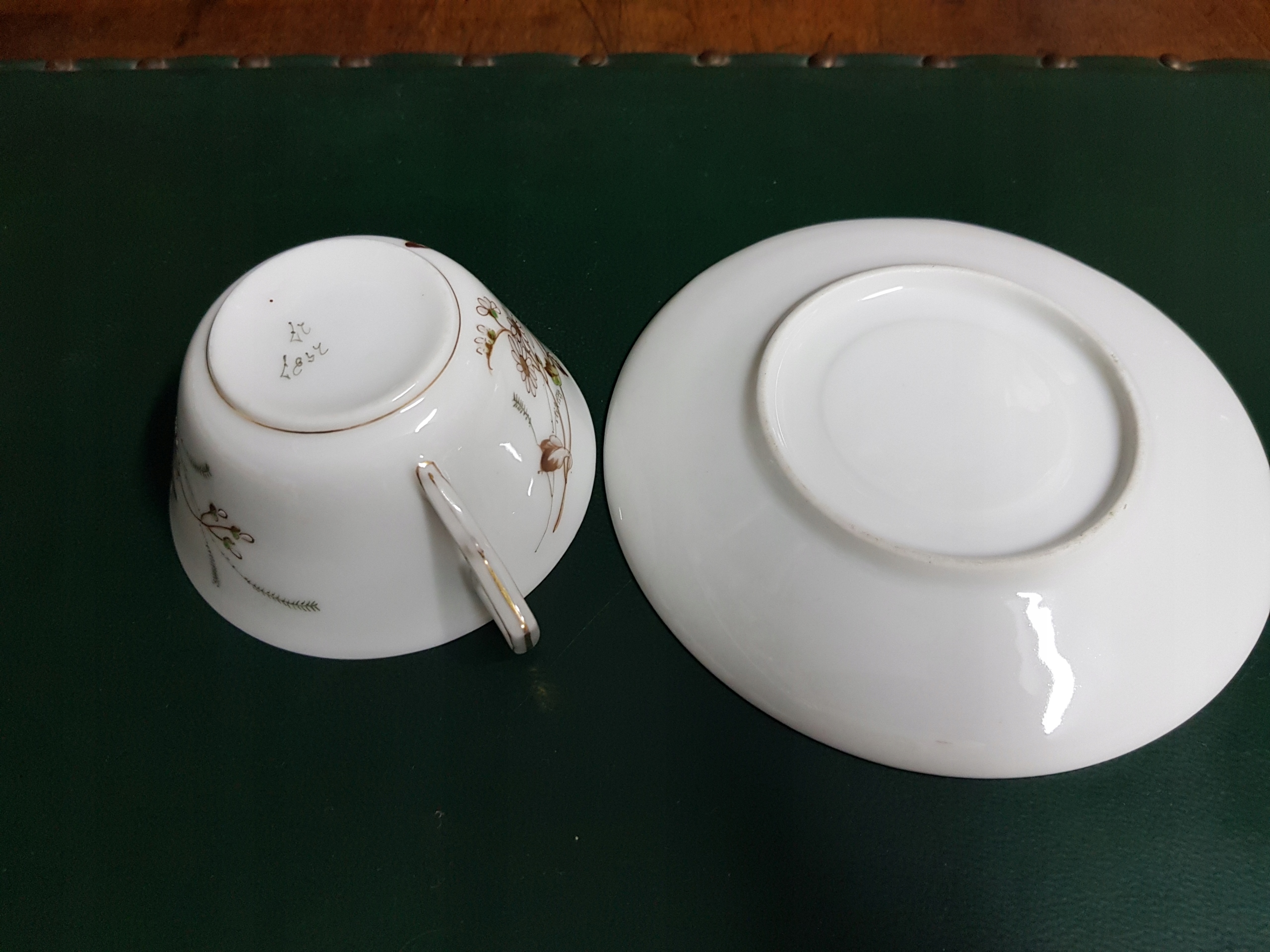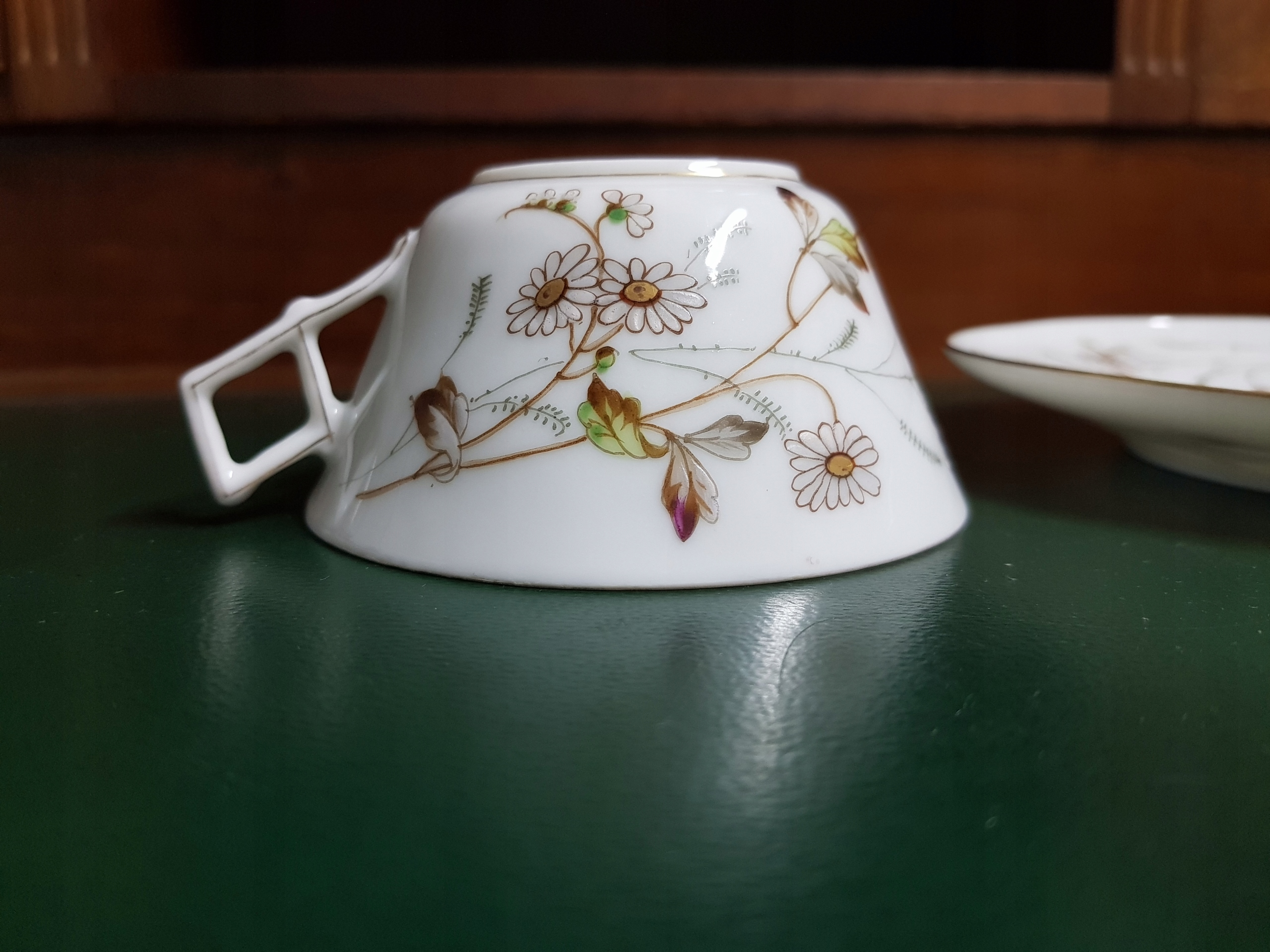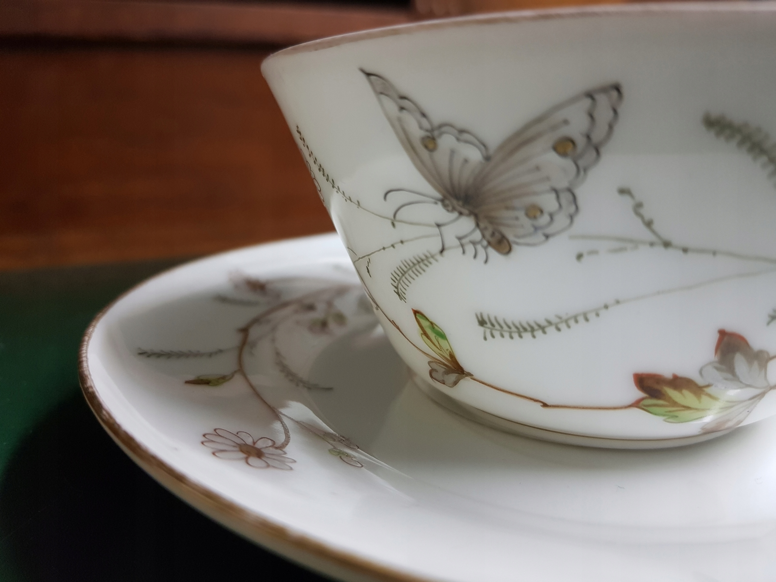 Предмет аукциона — старинная чайная чашка с блюдцем. Фарфор чашки довольно тонкий. Чашка украшена мотивом цветов, бабочки и сусального золота. p>