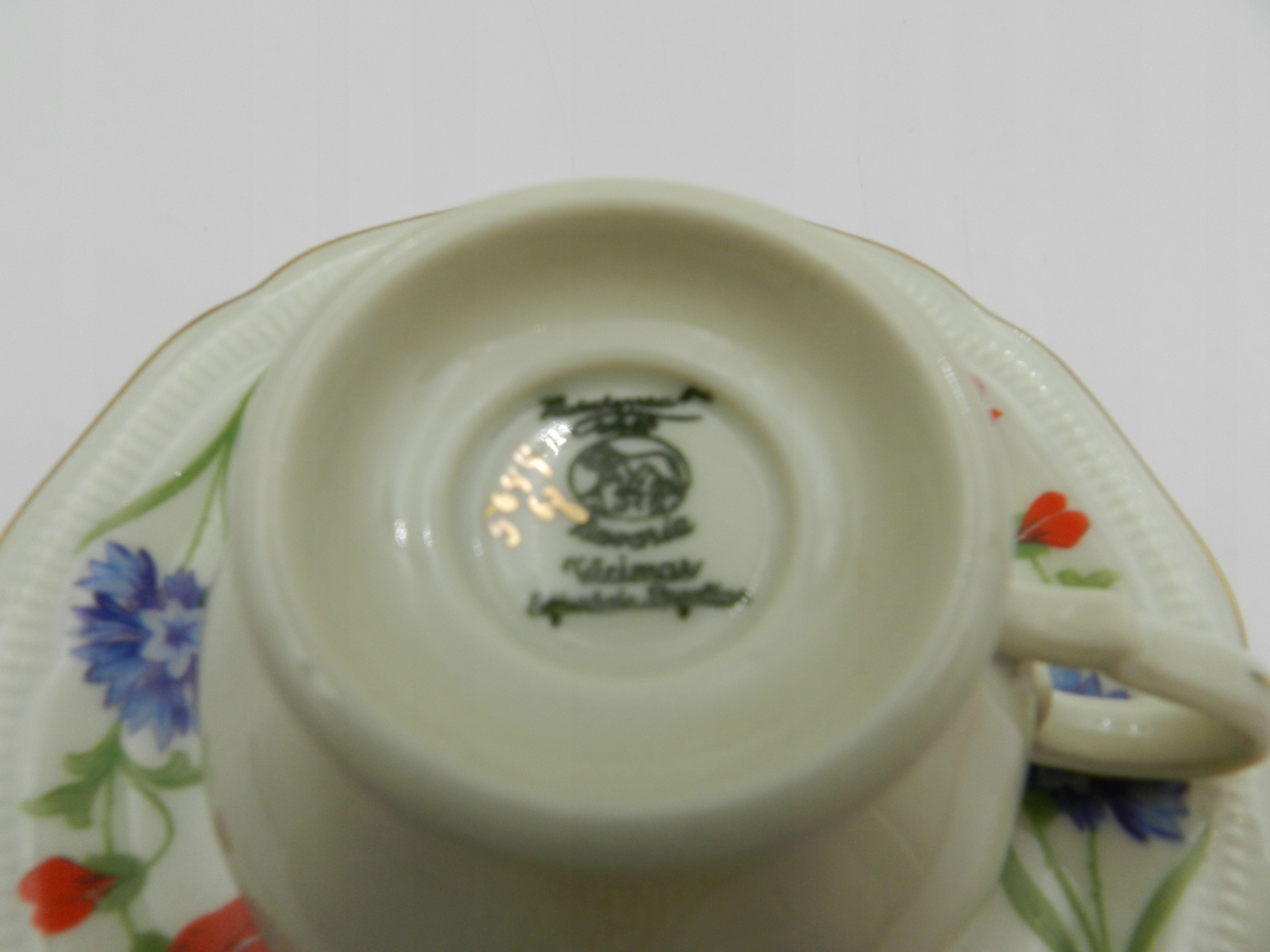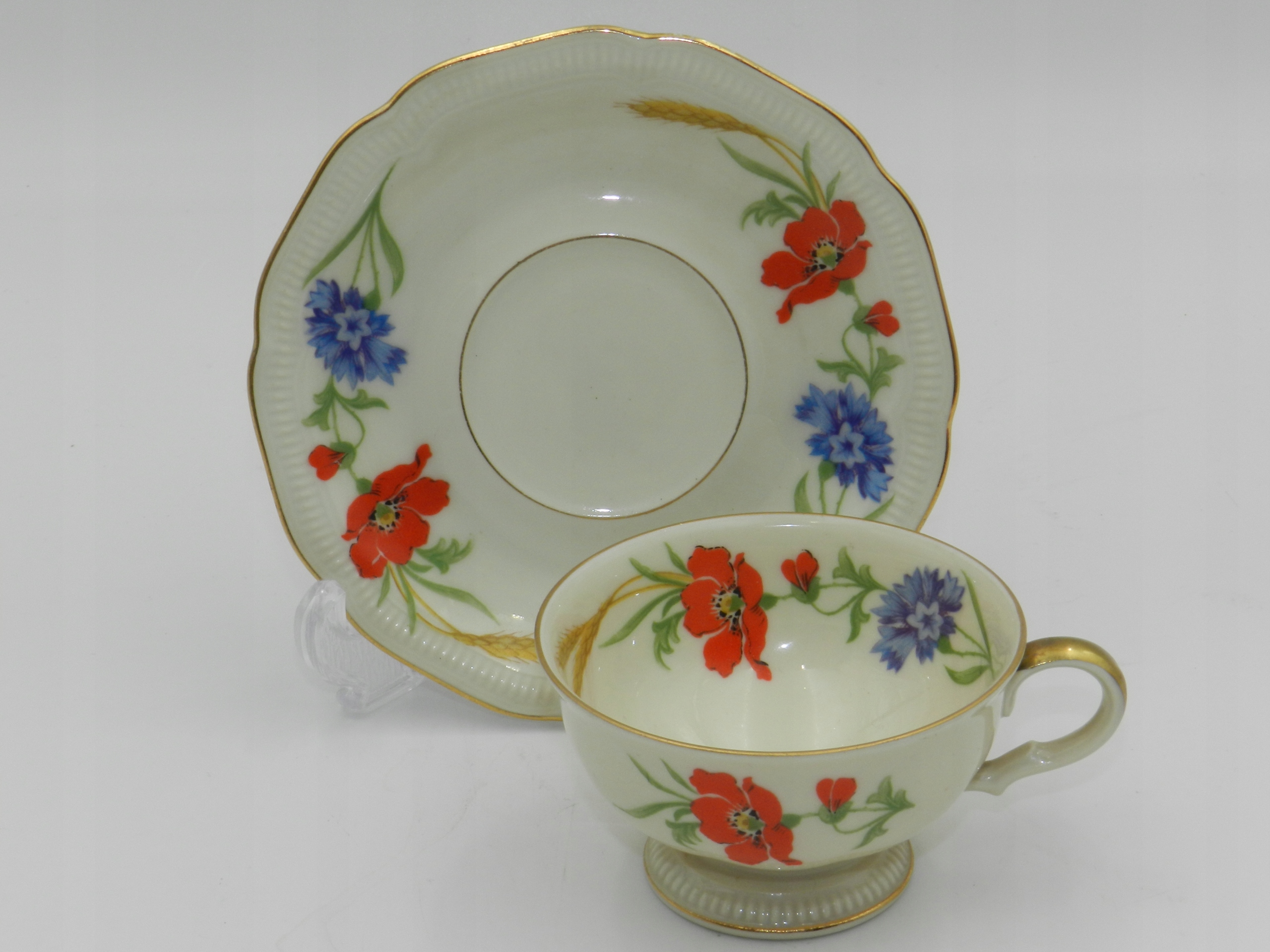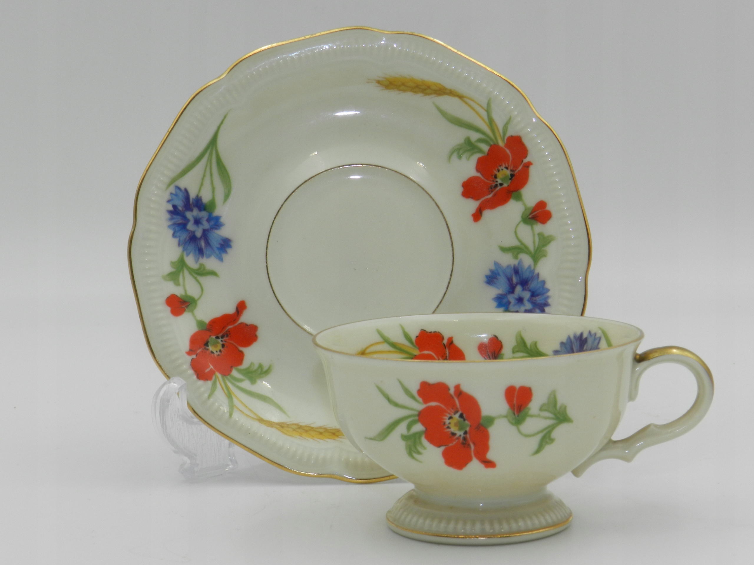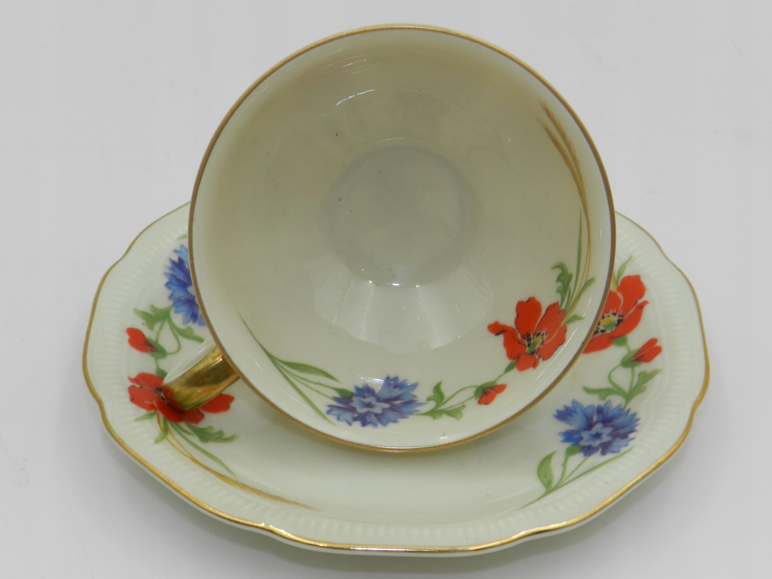 Высококачественный фарфор цвета слоновой кости, украшенный редким растительным мотивом в виде композиции из цветов мака и василька и стеблей зерна. Также украшен внутри чашки :)