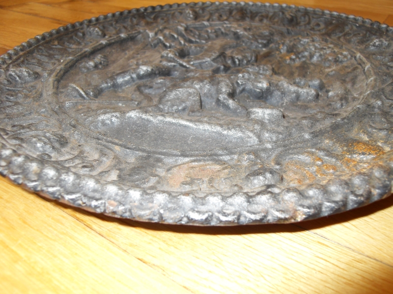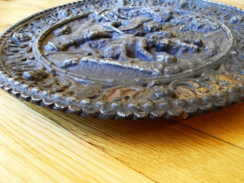 Старая чугунная тарелка большая охотничья сцена Погонь