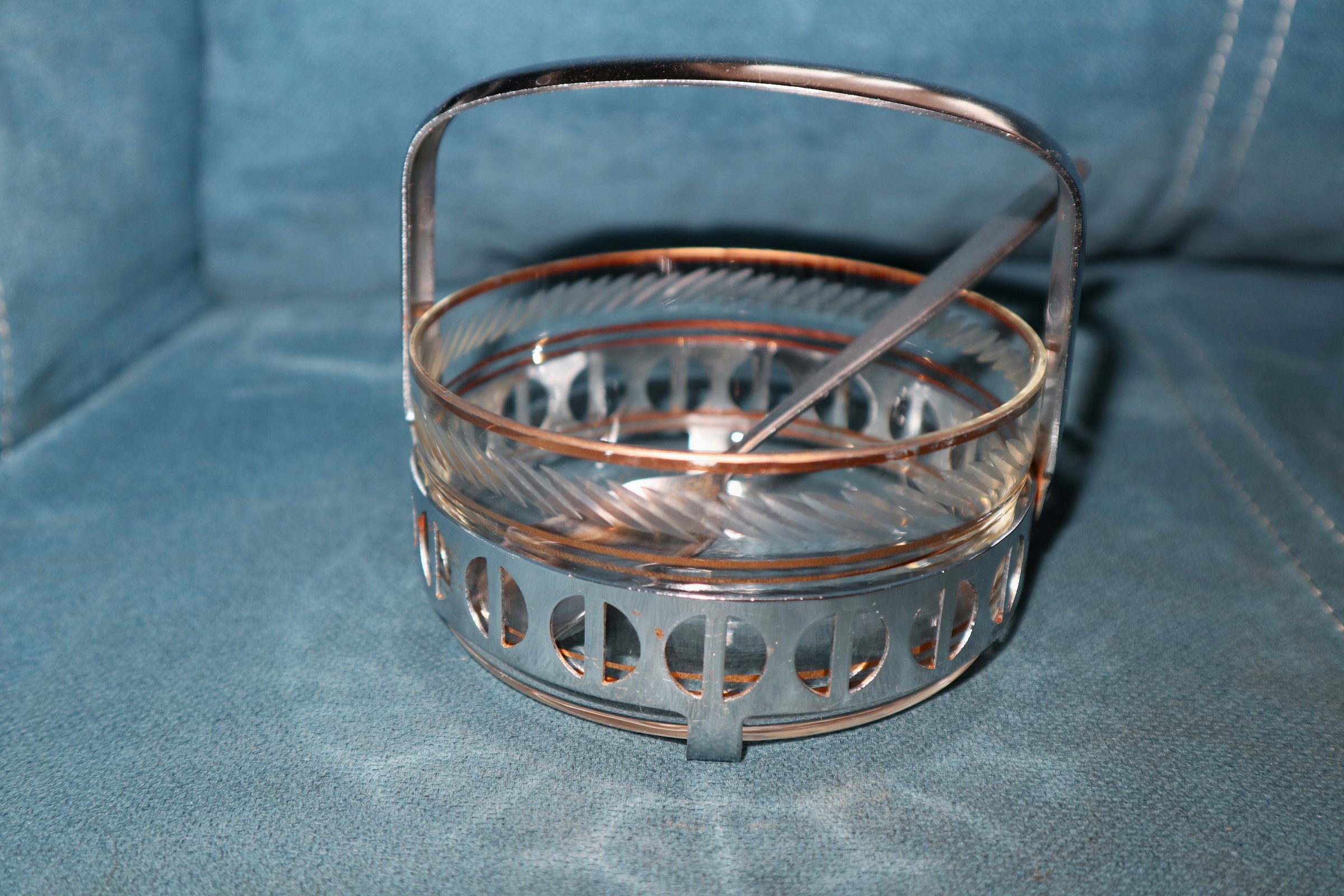 КРАСИВАЯ САХАРНИЦА СО СТЕКЛЯННОЙ ВСТАВКОЙ, БЕЗ ТРЕЩИН И СКОЛОВ, С ОБРЕЗОМ ПО КРАЯ И ПОЗОЛОЧЕНИЕМ, ВЫСОТА 5,5 см, С ТЕЛОМ 10 см, ДИАМЕТР 11 см. ВНИМАНИЕ! ЛОЖКА/СОВОК ОТ HEFRA.