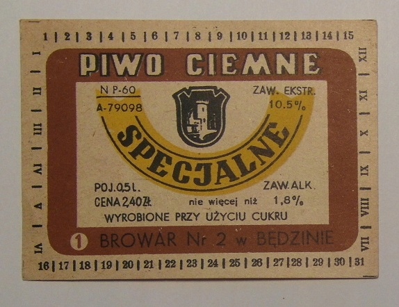 STARA ETYKIETA PIWO CIEMNE SPECJALNE BROWAR NR 2 BĘDZIN