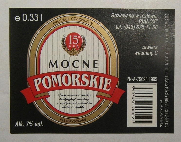 STARA ETYKIETA PIWO MOCNE POMORSKIE BROWAR CZARNKÓW ROZLEWNIA PIANOX KOPYŚĆ