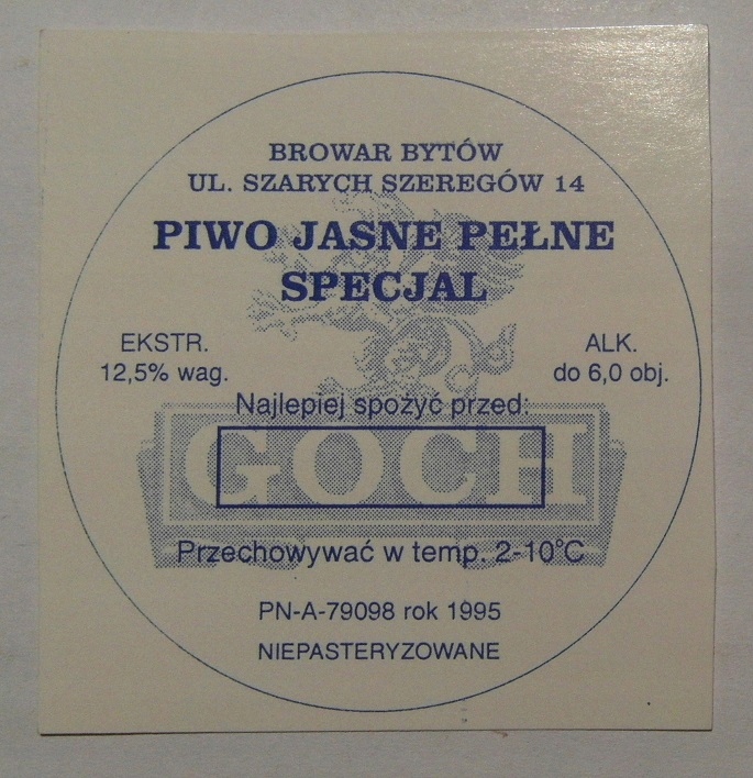 STARA ETYKIETA SAMOPRZYLEPNA NA KEG PIWO JASNE SPECJAL BROWAR GOCH BYTÓW