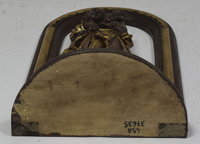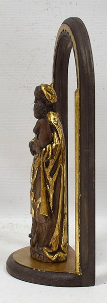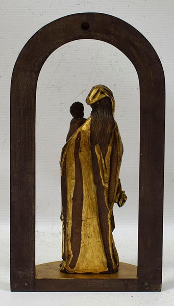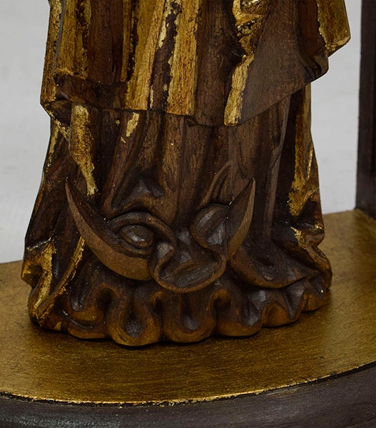 Старинная статуэтка, вырезанная из дерева, изображающая Марию с Младенцем Иисусом, стоящую на полумесяце. Статуэтка частично покрыта чешуйками шлагметалла.