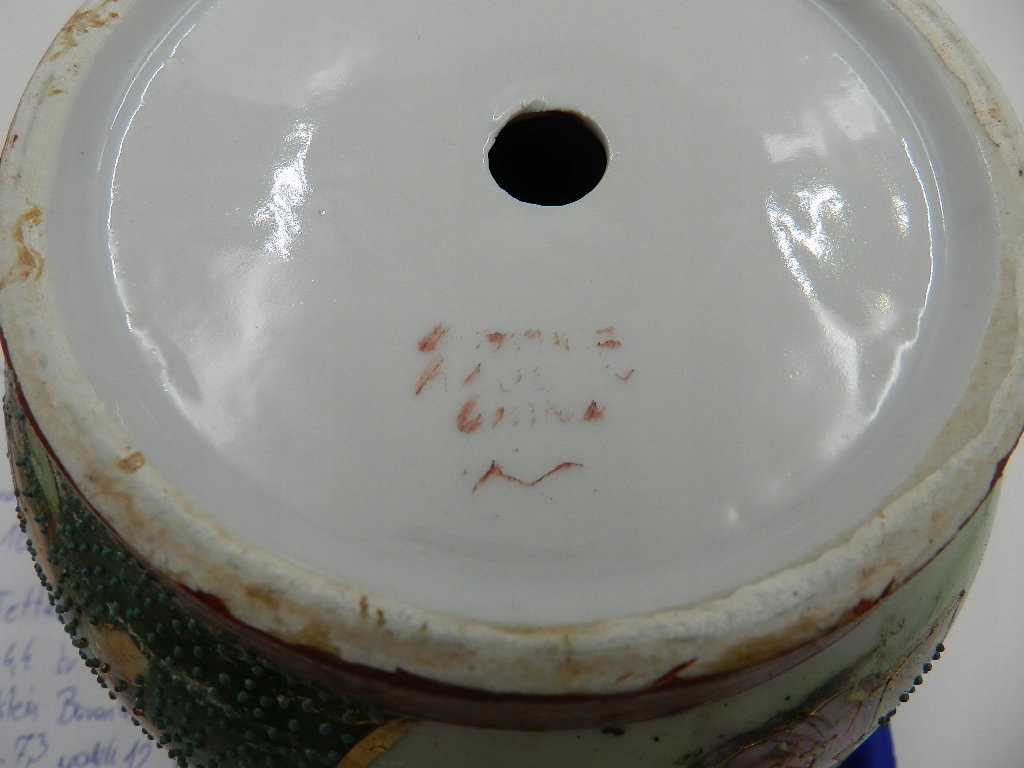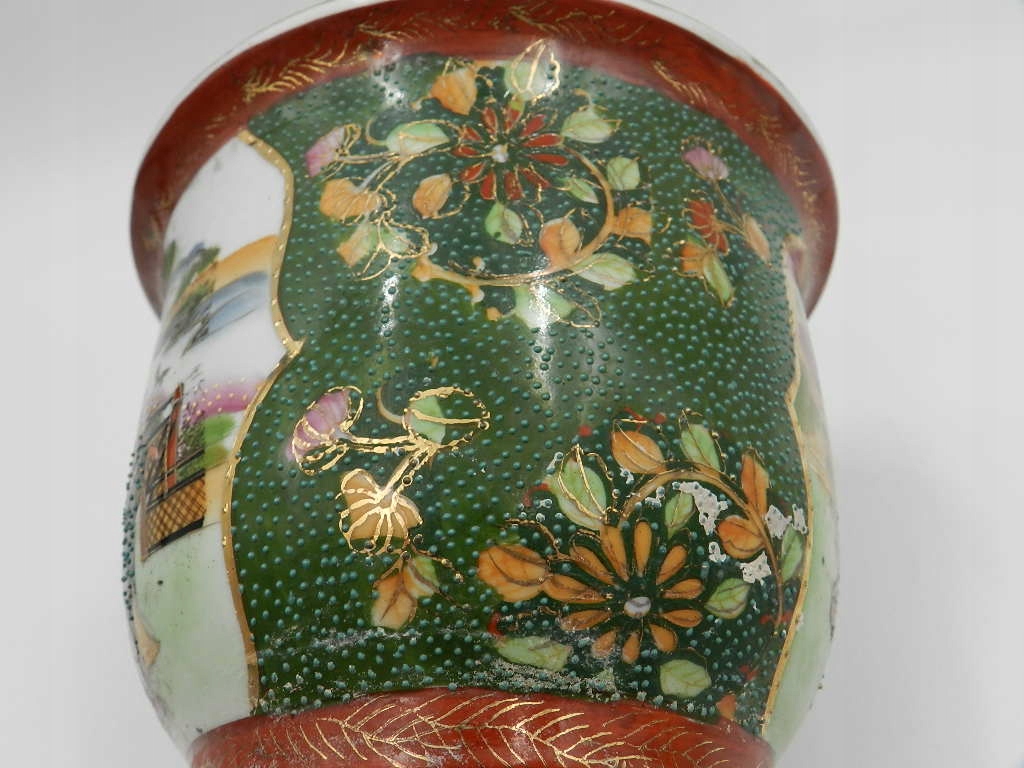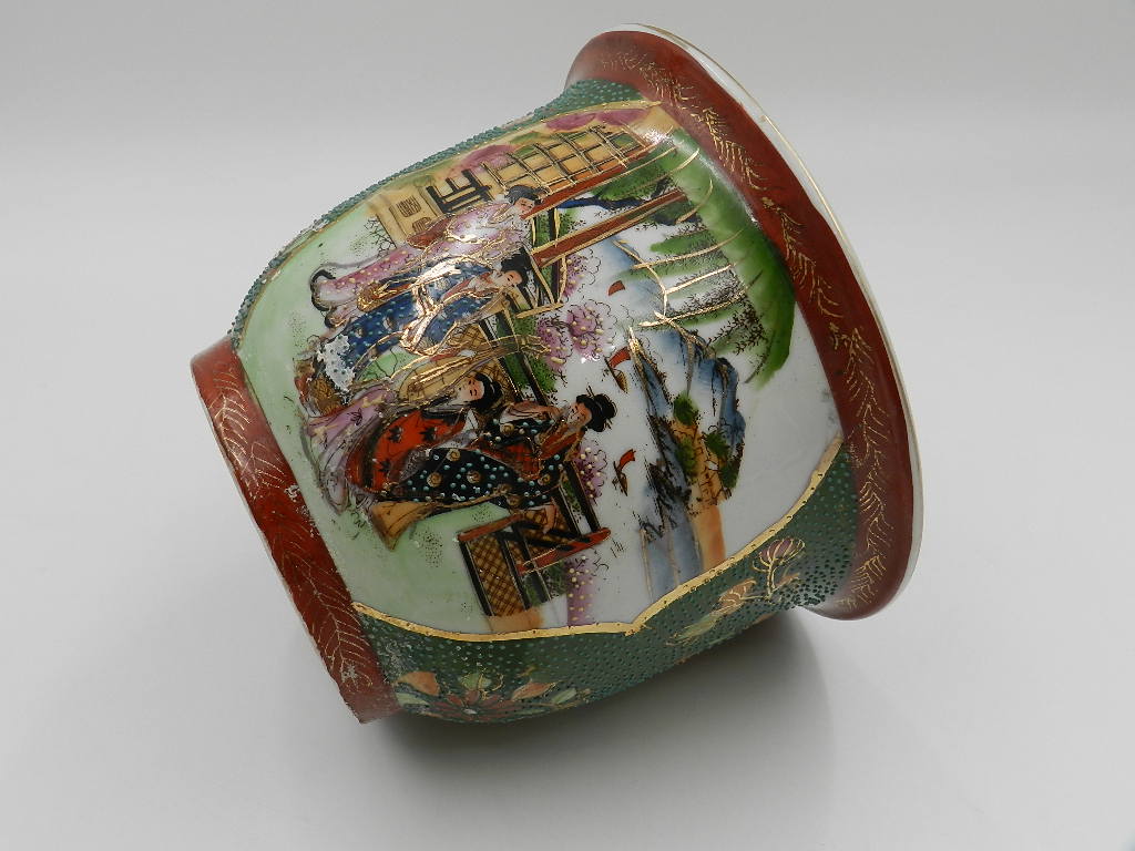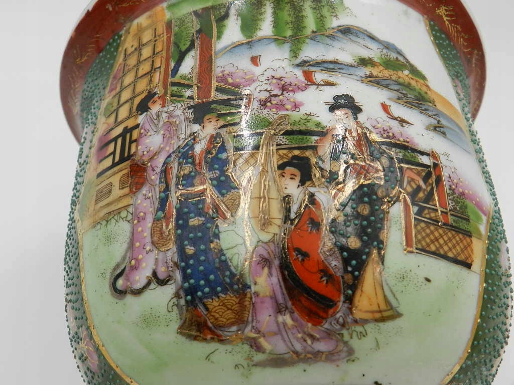 Исключительно красиво и богато оформленный вручную цветочными мотивами и прекрасными японскими жанровыми сценами и пейзажами, экспонат с удивительной палитрой красок.