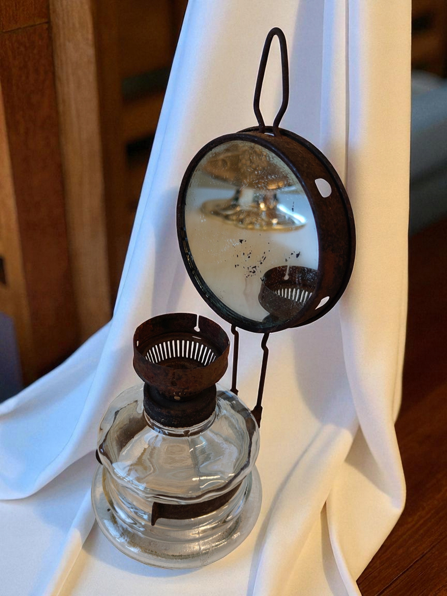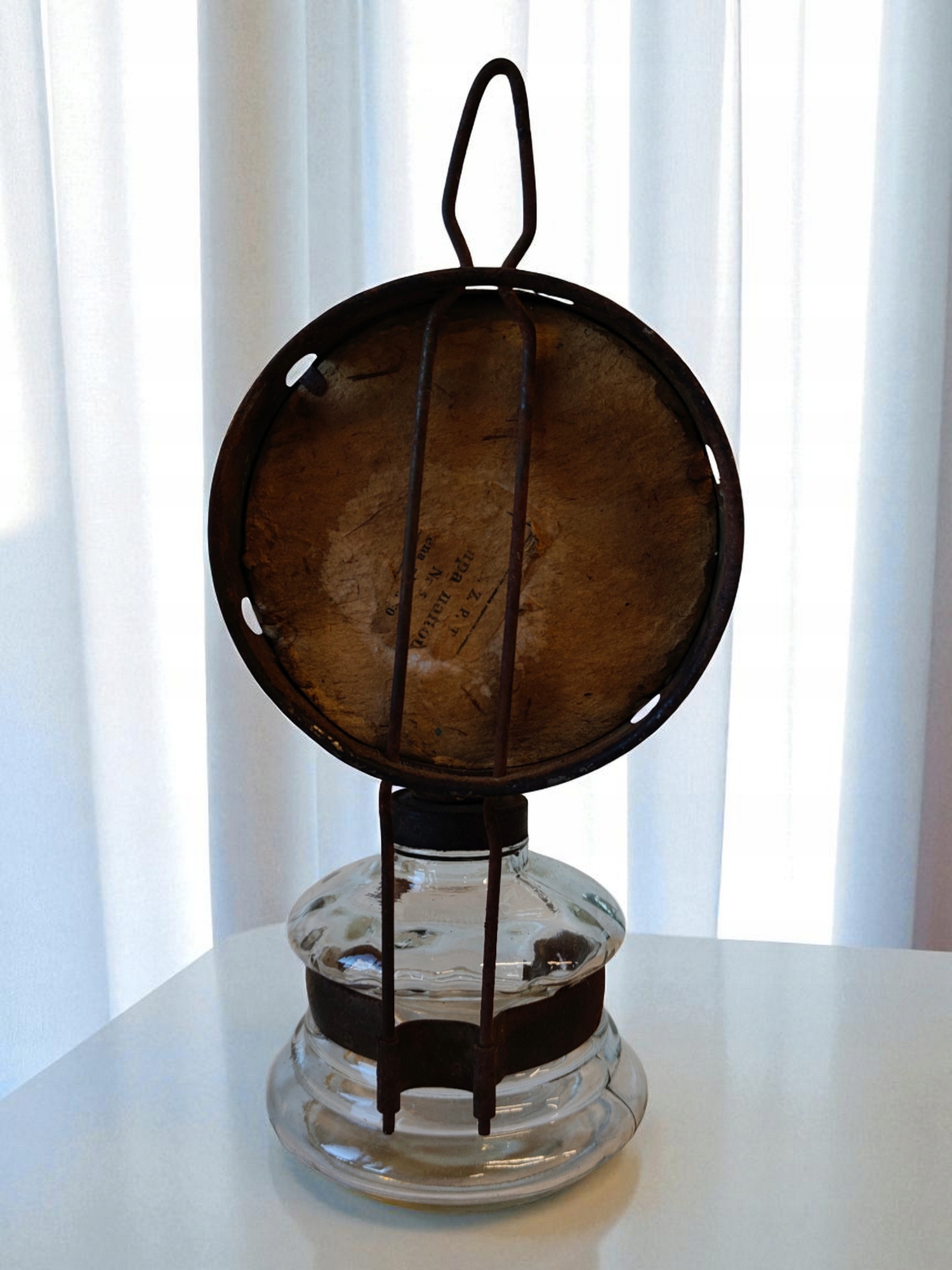 из металла и стекла, с классической фарой в форме круглого зеркала, которое усилило свет пламени. Целое является прекрасным примером старого мастерства и практического дизайна прошлых лет.