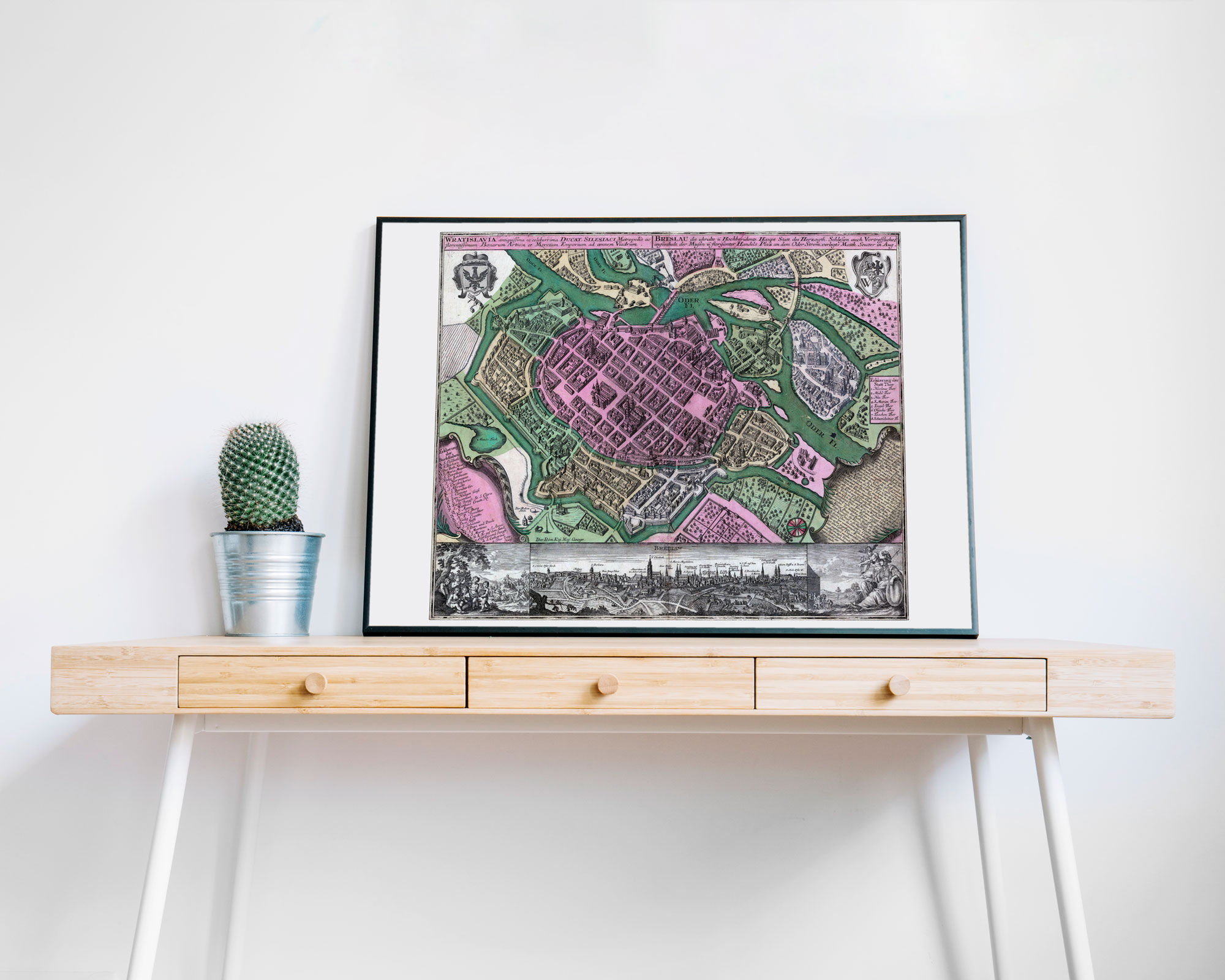 Воспроизведение старой карты плана Вроцлава примерно с 1735 года, Маттхаус Сейттер. Название карты в оригинале: Breslau Die Uhralte U [nd] Hochberühmte haupt stat des herzogth [um] schlesien auch vortrefflicher auufenthalt der musen u [nd] Флориз 70x50 см