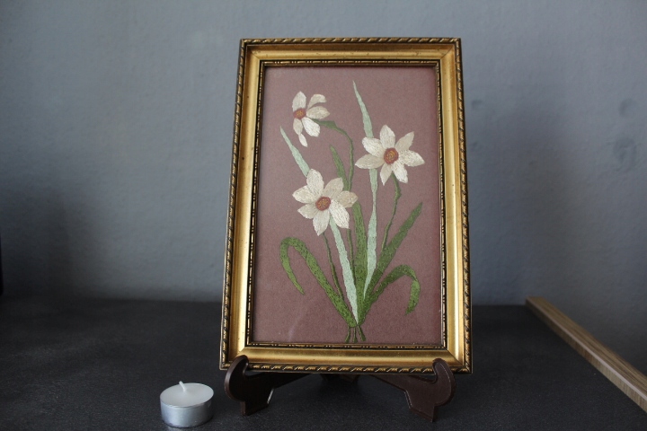 СТАРА КАРТИНКА, ПОЗОЛОЧЕНА РАМКА,ВИШИВКА, НАРЦИСИ, НАРЦИС 25/208