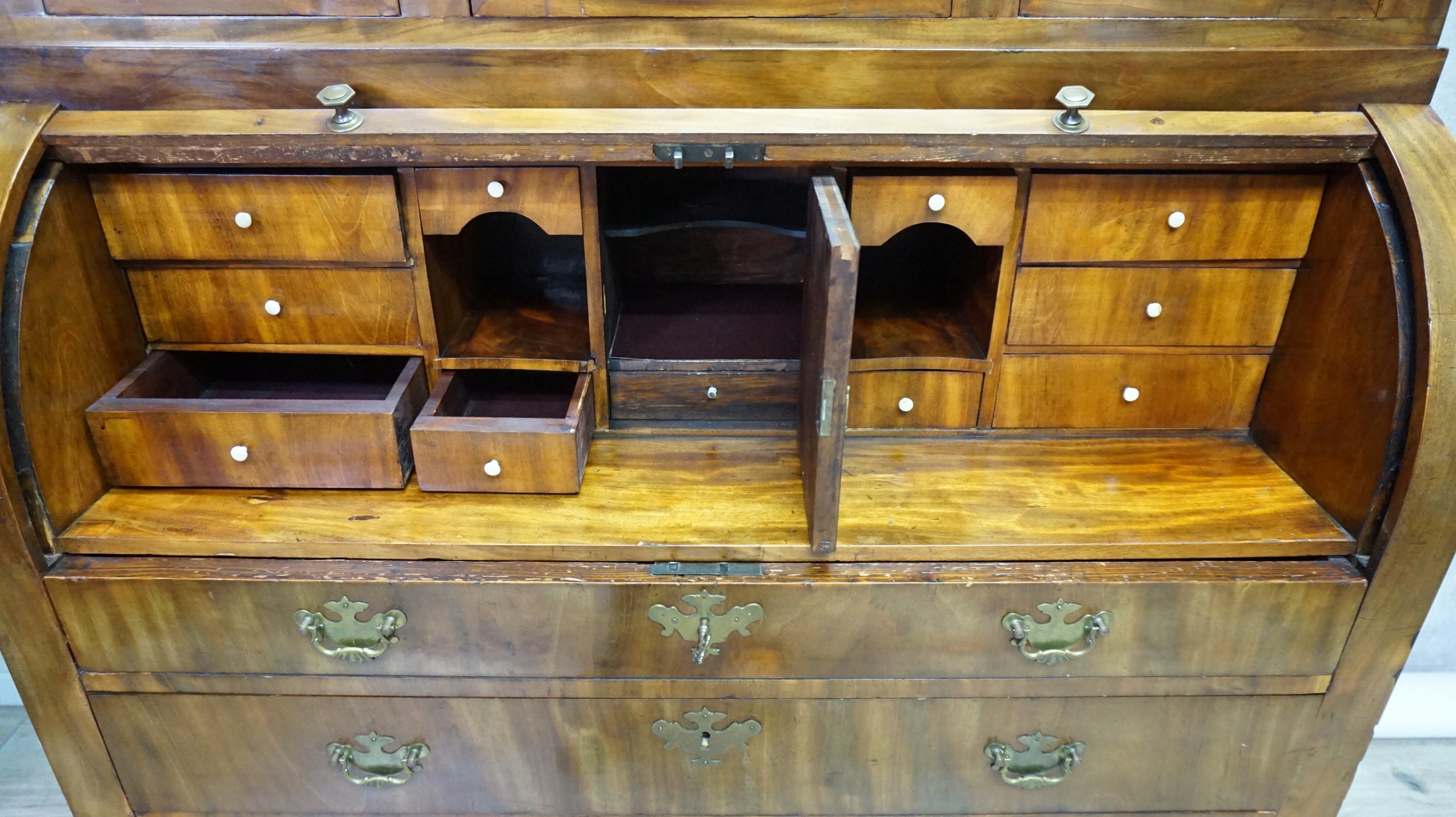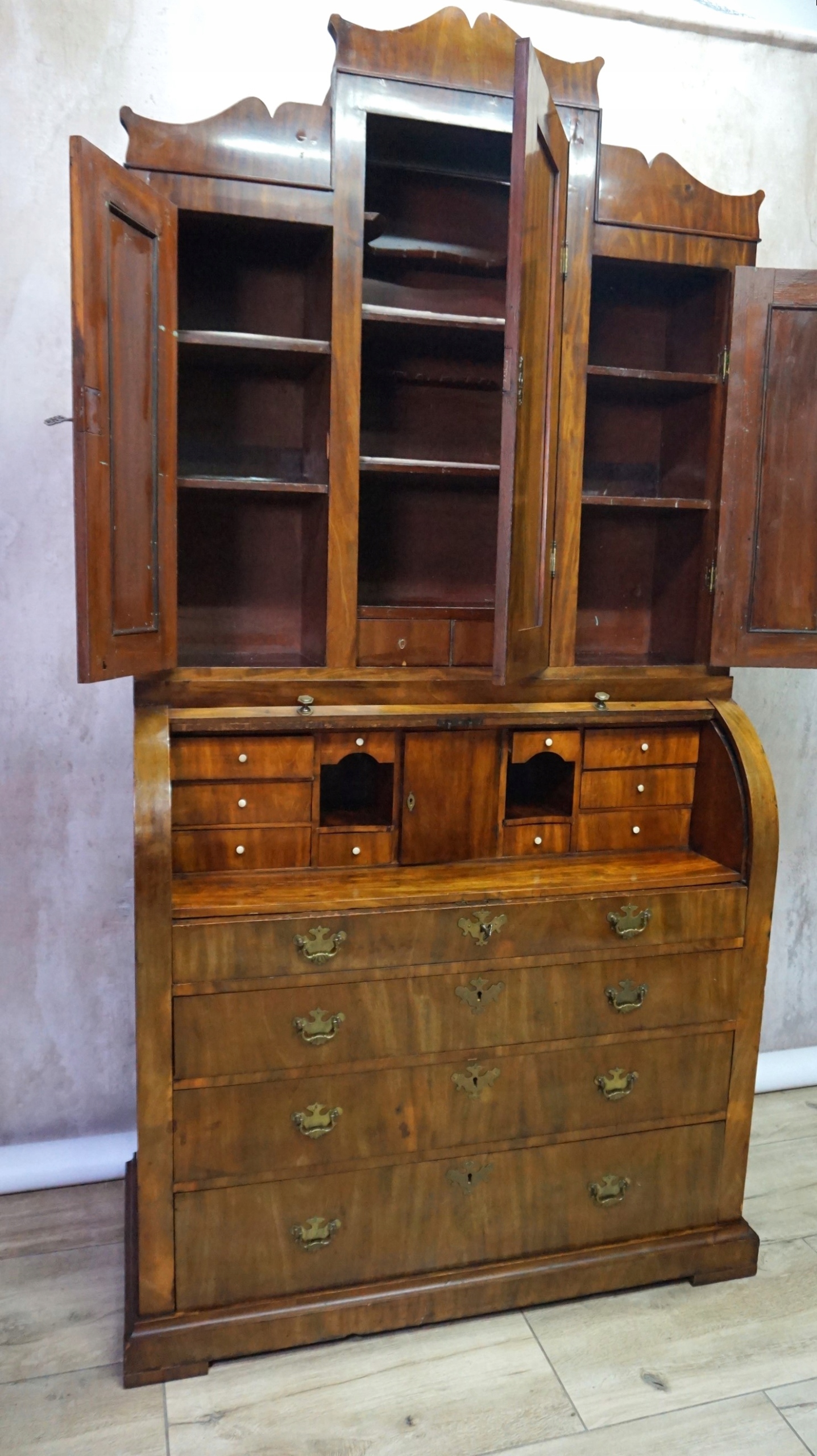 Состоит из двух частей - верхняя представляет собой трехдверный книжный шкаф, нижняя - комод с секретаршей