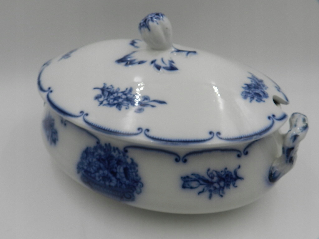 Белый фарфор богато украшен кобальтово-синими мотивами в виде сложных цветочных композиций и нежных полосок.