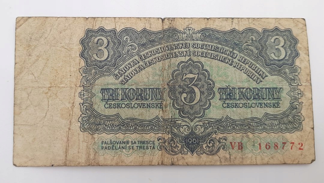 Старая коллекционная банкнота номиналом 3 кроны 1961 года, Чехословакия.