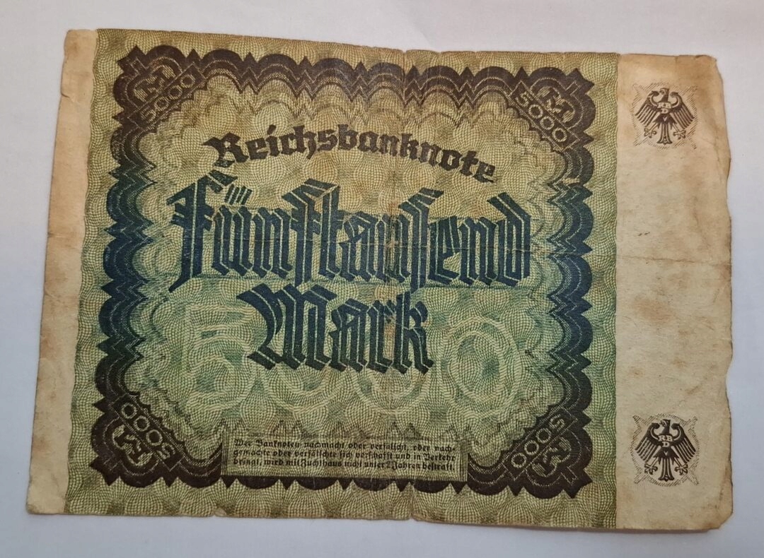 Старая коллекционная банкнота Германии 5000 марок 1922 года.