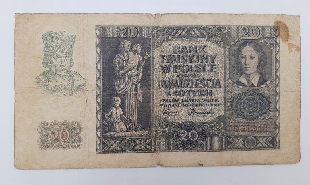 Стара колекційна банкнота Польща 20 злотих 1940 р