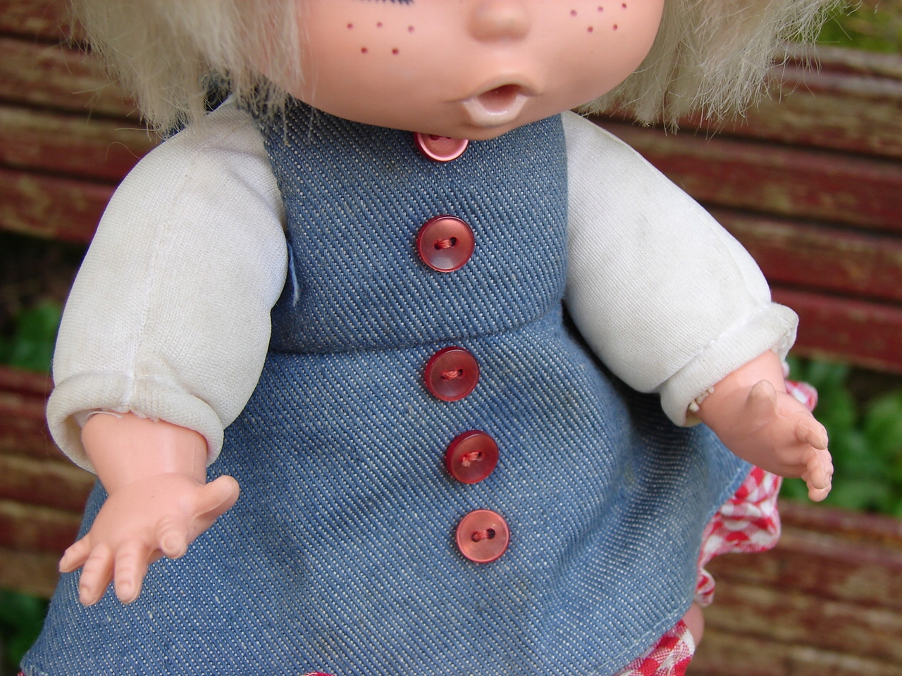 Кукла имеет следы использования. Кто-то делал себе прическу из стриженных волос. На шейке видны трещины, которые при увеличении показаны красной стрелкой. На платье отсутствует одна часть застежки. Одежду необходимо освежить и постирать.